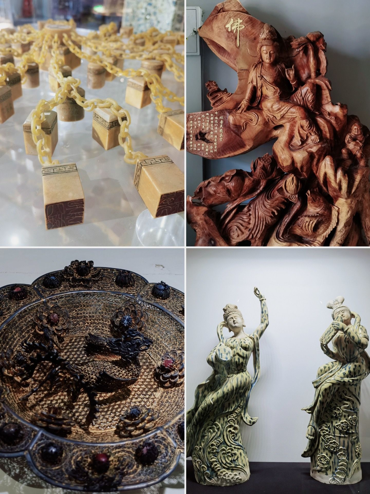 馆内有两栋主体建筑,占地1600平米,室外有楼台亭院,室内有瓷陶玉金以及民俗老物件等收藏品
