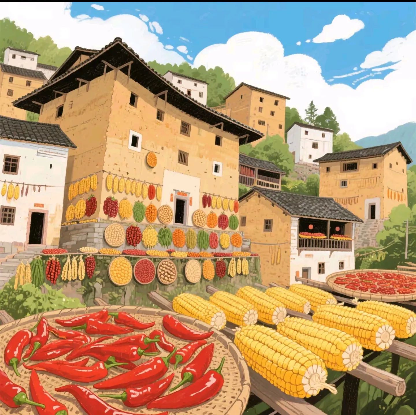 300栋 **夯土黄墙** 错落山腰,家家屋檐下挂满玉米、辣椒、南瓜,像一座 **立体的秋日调色盘**。