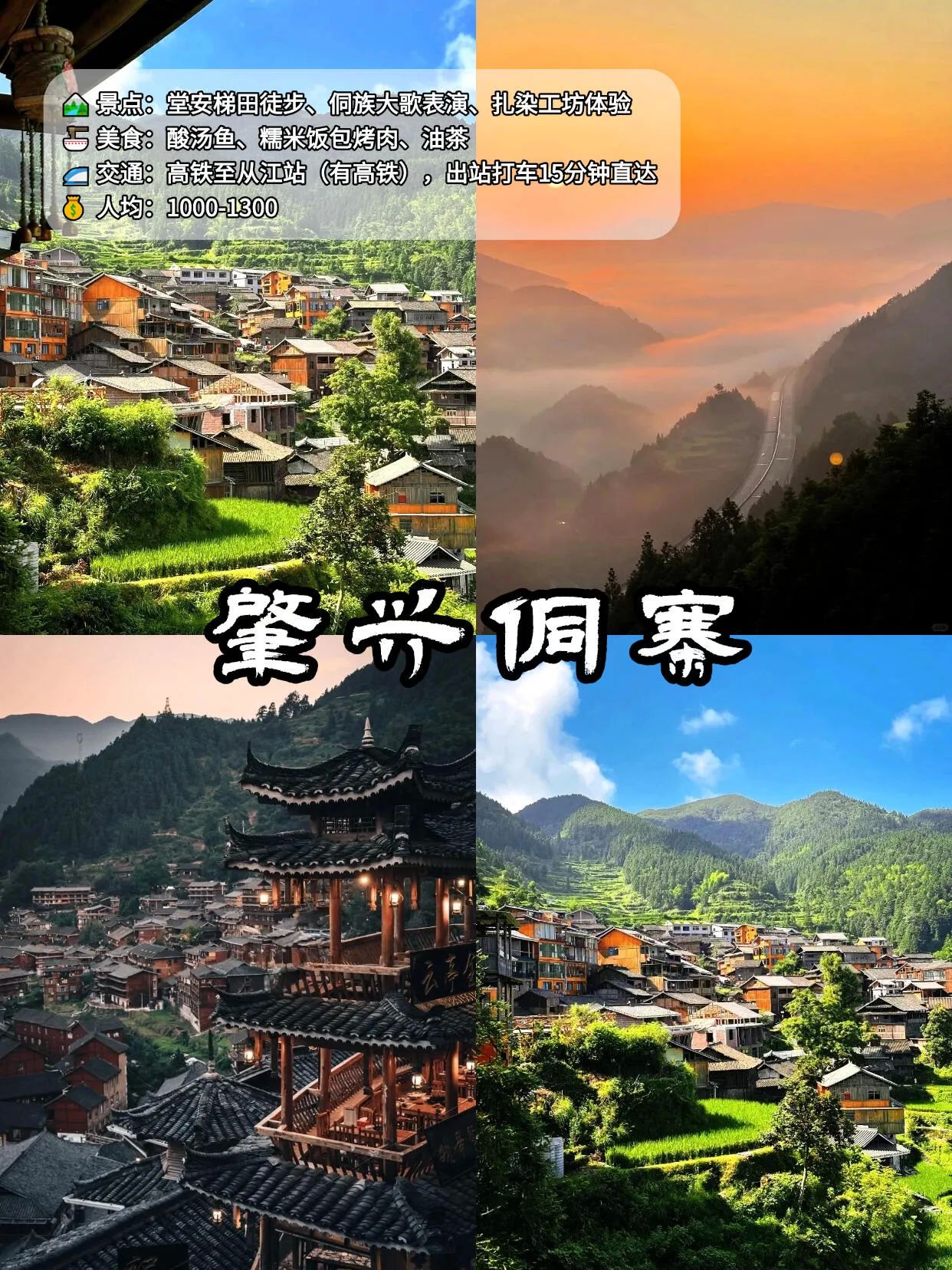 徒步梯田,感受田园风光;体验扎染,制作专属纪念品;晚上听侗族大歌入眠,超惬意。肇兴侗寨建筑风格独特;堂安梯田景色秀丽。从贵阳坐高铁到从江站,再转车前往。住宿选在侗寨里的民宿。酸汤鱼、油茶是当地特色美食。
