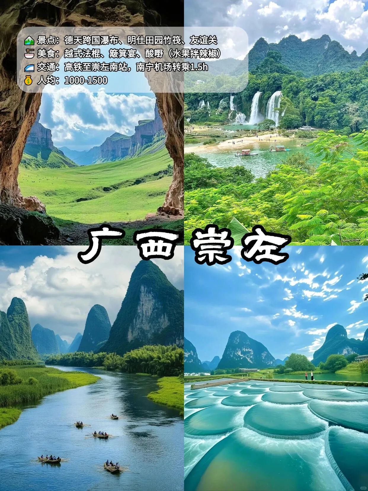 跨国瀑布气势磅礴,竹筏漂流悠然自得,还能实现酸嘢自由。德天跨国瀑布震撼壮观;明仕田园山水如画,仿佛走进水墨画。南宁坐动车到崇左南站,再转车前往景点。住宿推荐明仕田园附近的民宿。当地的老友粉、卷筒粉别错过。
