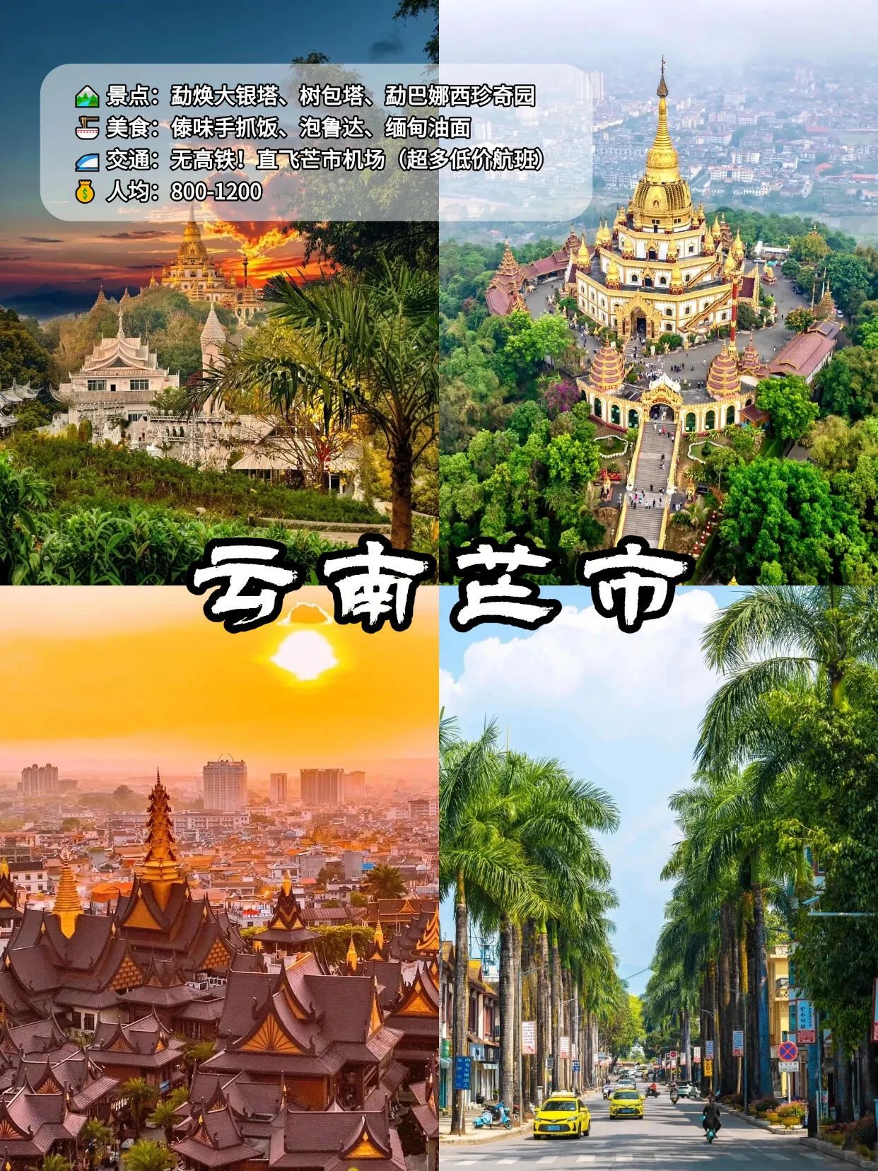 银塔洁白圣洁,穿上傣装拍照超有氛围感;逛夜市,来一份手抓饭,各种特色小菜搭配软糯米饭,超有仪式感。菩提寺、树包塔也值得一去,感受浓厚的佛教文化。芒市有机场,直飞超方便。住宿选在市区,出行觅食都方便。香茅草烤鱼、泡鲁达一定要试试。