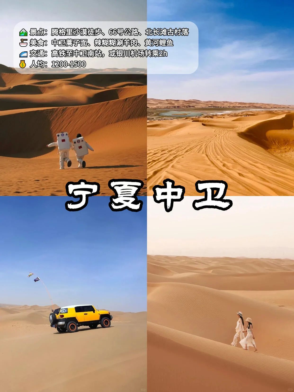 在沙漠徒步,追逐落日余晖,感受大漠的雄浑壮阔;站在66号公路,分分钟拍出西部风情大片。沙坡头景区能体验滑沙、骑骆驼;北长滩古村落可以感受古朴的黄河文化。从银川坐高铁1小时就能到中卫南站。住宿可以选择沙漠星星酒店,沙漠观星超浪漫。记得尝尝当地的手抓羊肉和蒿子面。