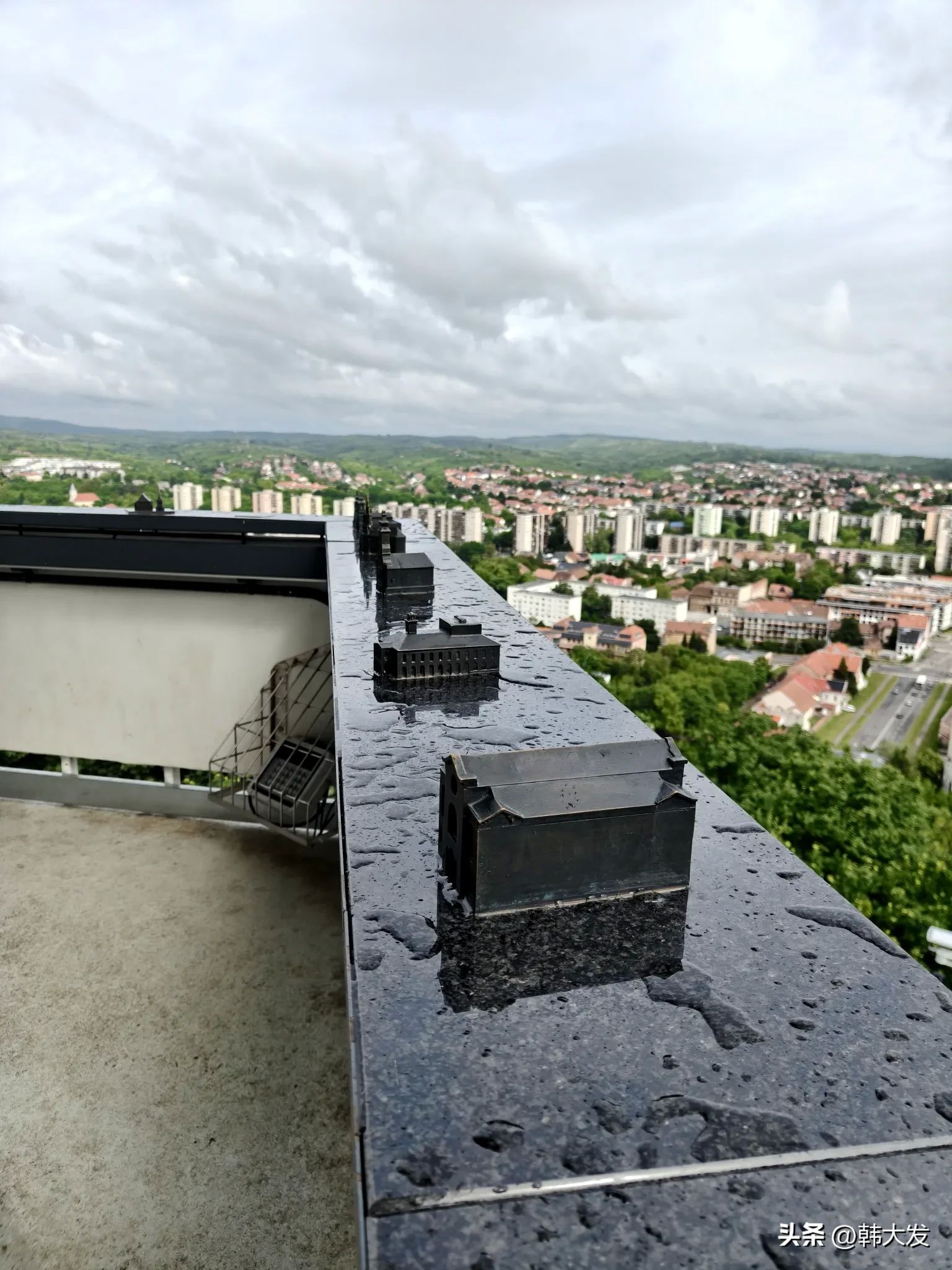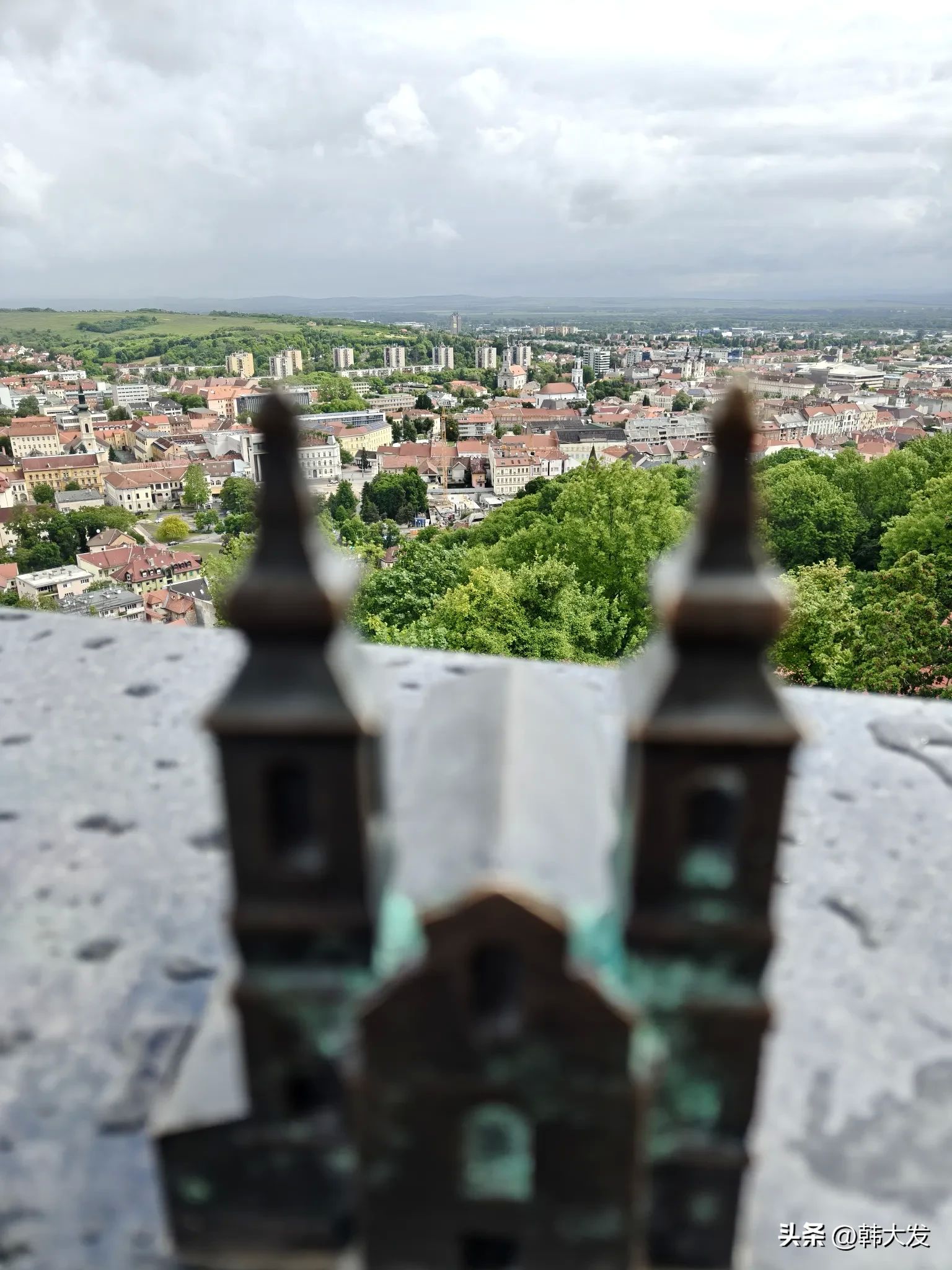 然后我从米什科尔茨火车站出来,导航前往米什科尔茨的市政厅。因为不知道在哪里购买公交车票,所以决定步行过去。途中经过米市有名的步行街,看到了来匈牙利之后的第三个民族品牌华为(还有万华、美的)。走了3公里到达米什科尔茨市政厅后,发现米什科尔茨著名的景点阿瓦西观景台就在旁边的小山上,于是爬了上去,可以俯瞰整个米什科尔茨市。