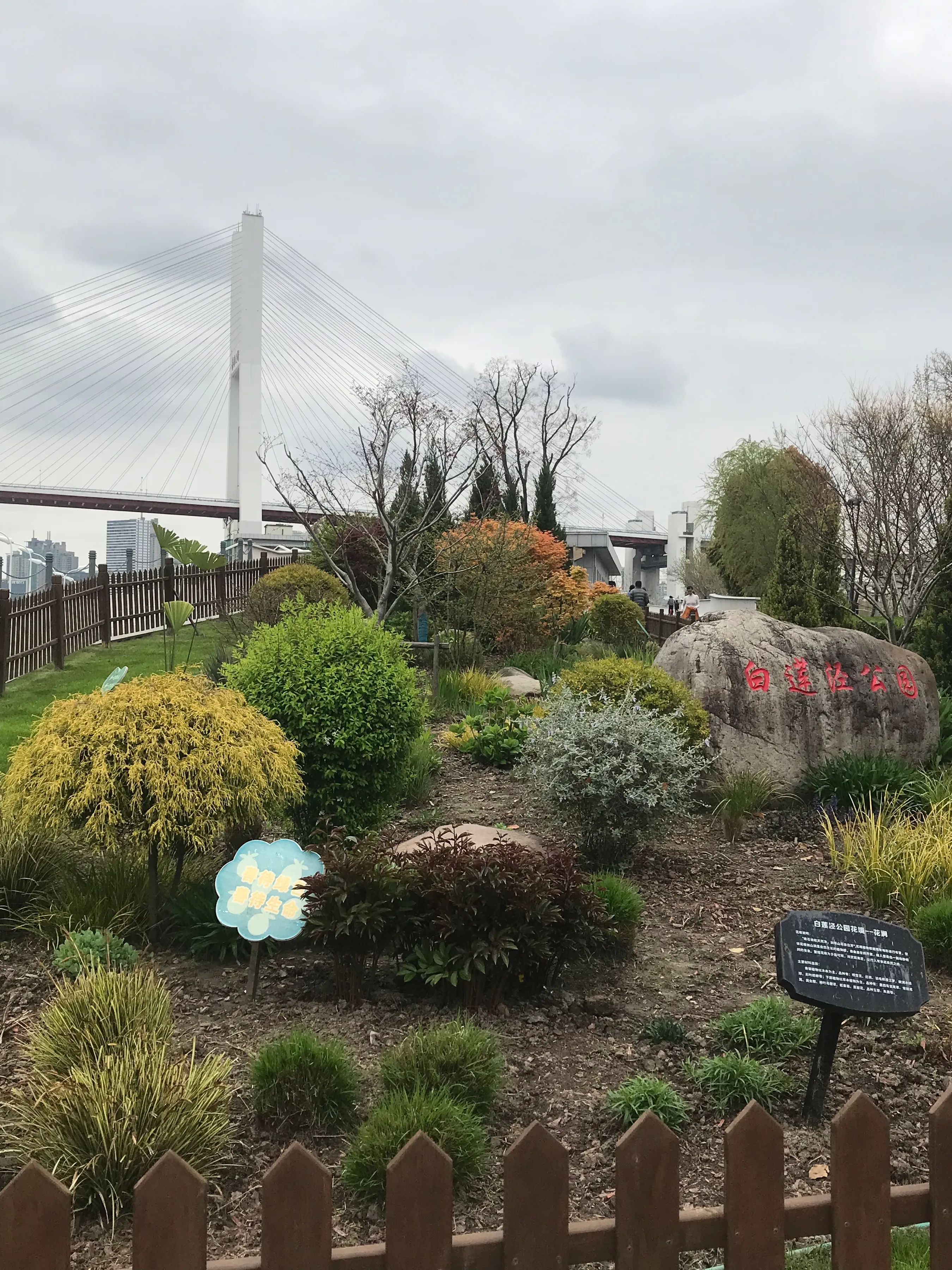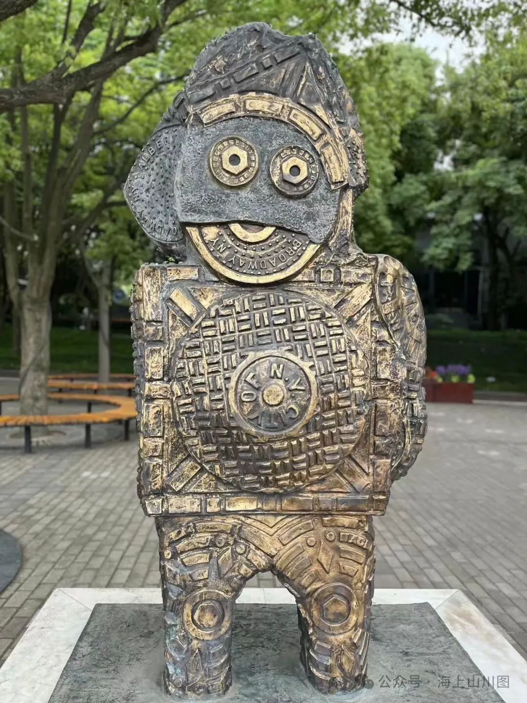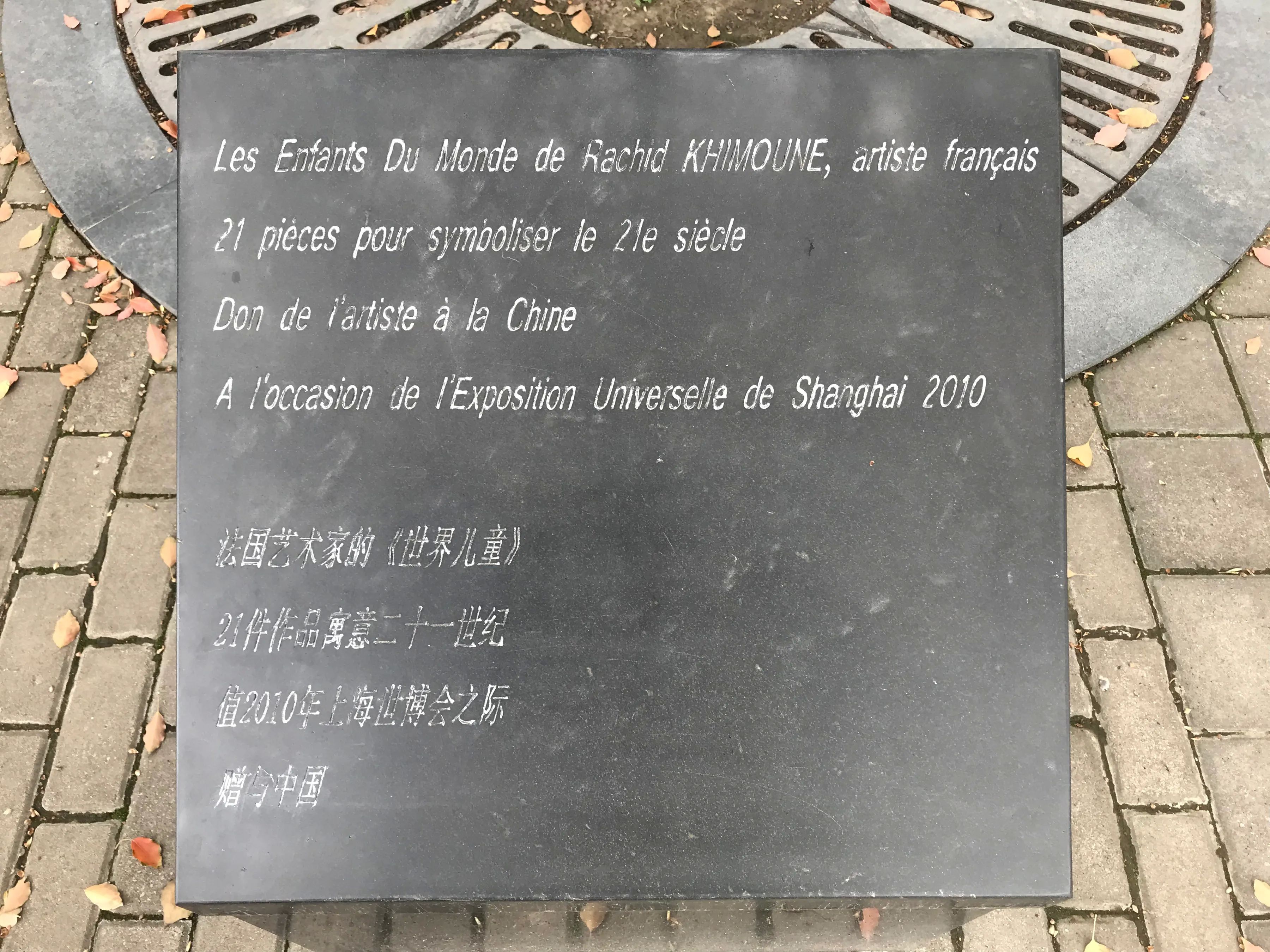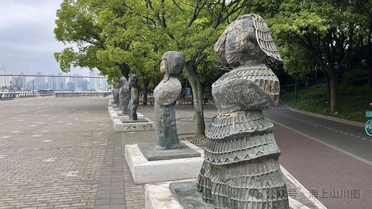 黄浦滨江东岸的白莲泾公园位于白莲泾入黄浦江口边,北接黄浦江、南至世博大道,西起“世博公园•亩中山水园”,东接南码头绿地。上世纪初陆续建起了美商大来码头和民族资本中兴码头。1950年由中国政府征用,改名白莲泾码头。1958年起白莲泾码头与中兴码头正式划归港务局。成为华东地区木材集散储运中心、上海港木材装卸专业码头。为了配合世博会的建设,2006年6月,白莲泾码头停止装卸作业,成为上海世博园规划用地。2010年世博会期间改建为世博M2码头。世博会后经改造成为黄浦江公共旅游码头。2018年,码头结合黄浦江两岸公共空间贯通工程实施进行了再度提升改造。白莲泾公园的亲水平台是一片开阔的滨江空间,青石板铺地,视线很开阔,江面也显得很开阔,往南望去,江对面当代艺术博物馆的大烟囱高高耸立,东边不远处的南浦大桥雄伟伫立,陆家嘴的三件套也在一群高楼间露出了高高低低的头。这里还有一排共计21个雕塑,这些雕塑来自法国艺术家瑞切德•凯莫,名为《世界儿童》,21件雕塑寓意21世纪,在2010年值上海世博会之际赠与中国。这些雕塑作品正面看是立体的,背面看是中空的,像是被剖开的套娃。娃娃的造型简朴,身上布满了来自不同国家、城市的窨井盖、铺路石组成的装饰图案。例如一个梳着丸子头,戴顶小圆帽的娃娃身上,有写着“北京市人民政府”和”上海复兴公园“字样的窨井盖,肩胛处还有两块”弹格路“图案。这一看就应该是”中国儿童“了。