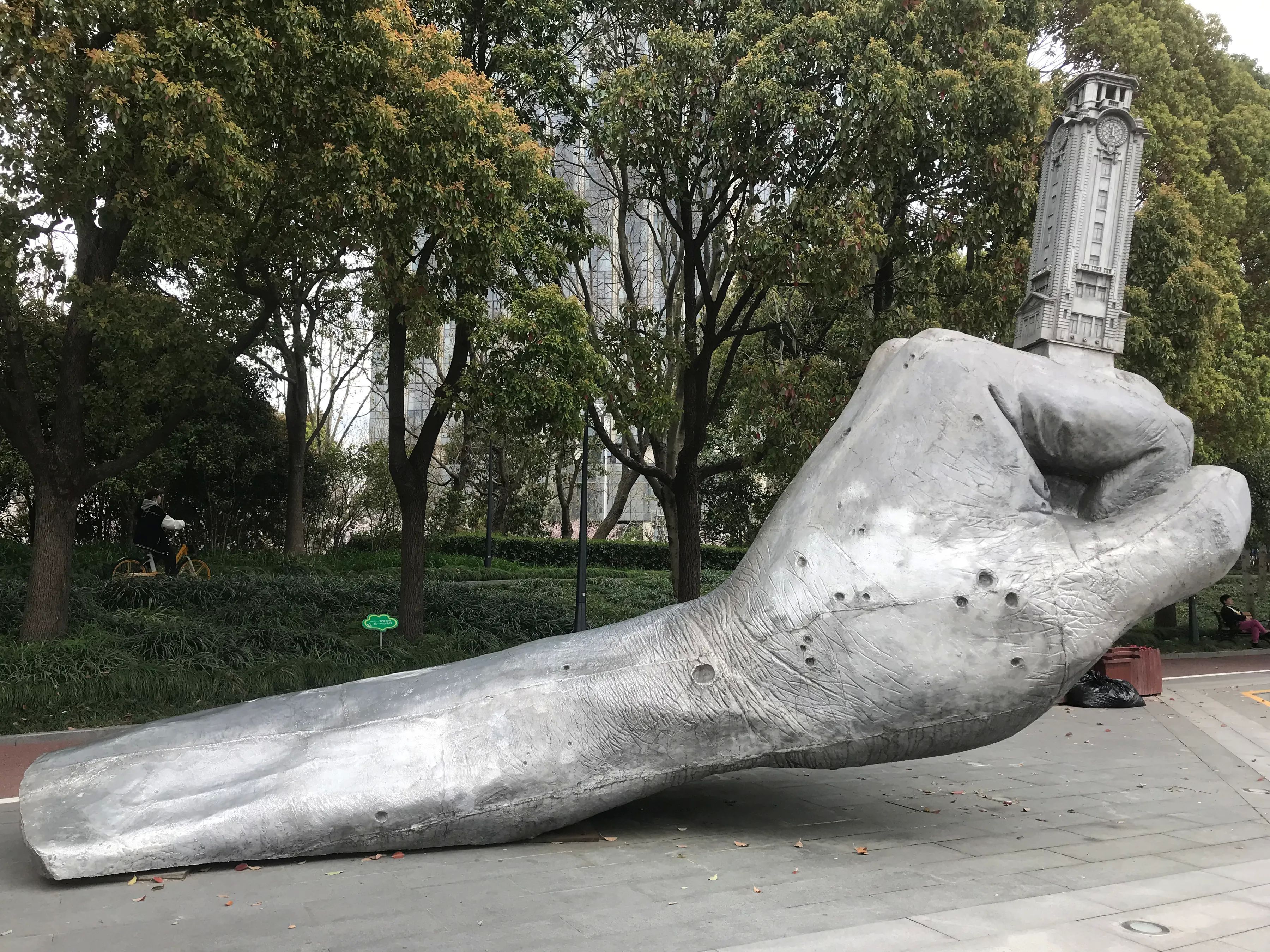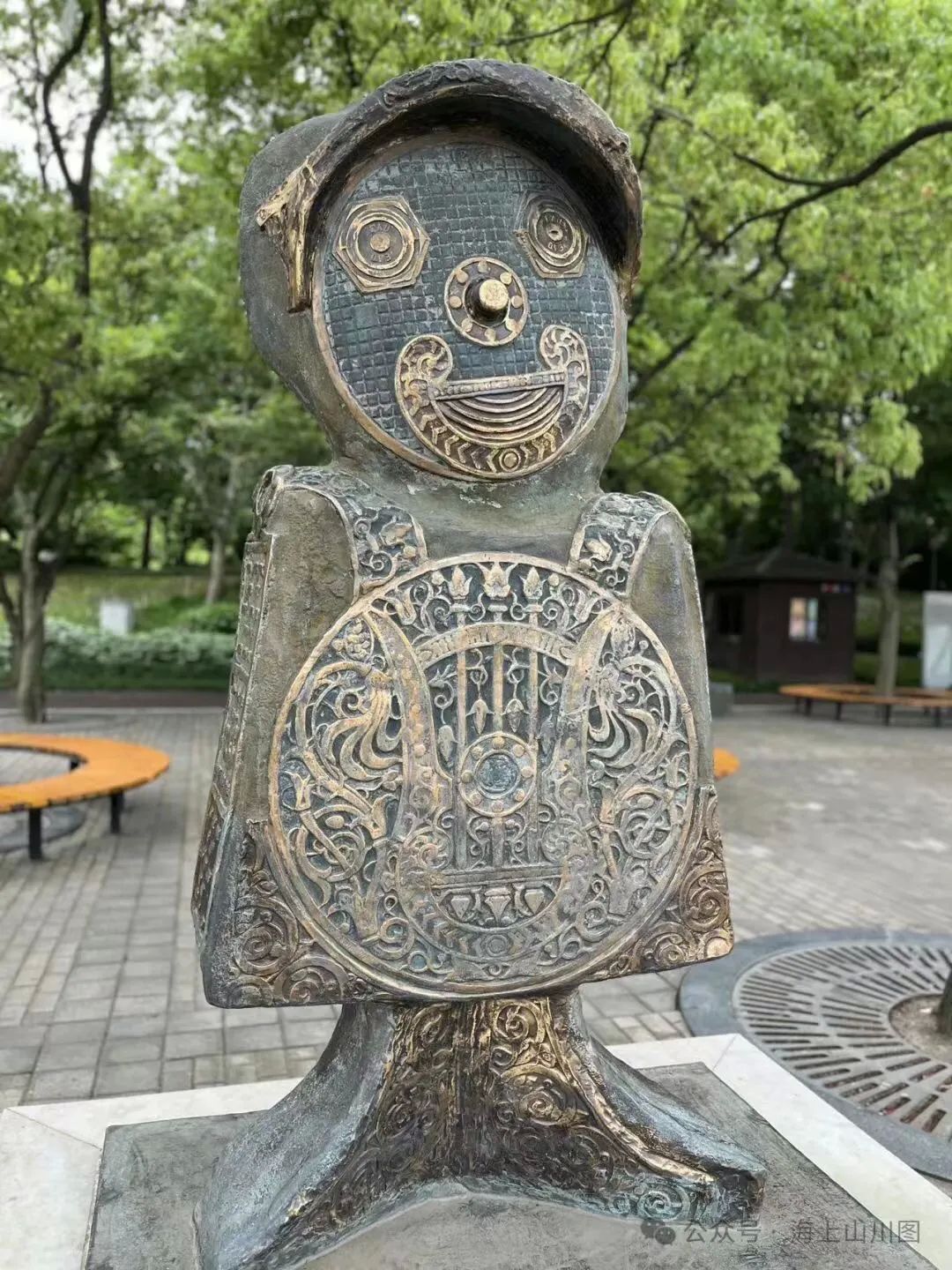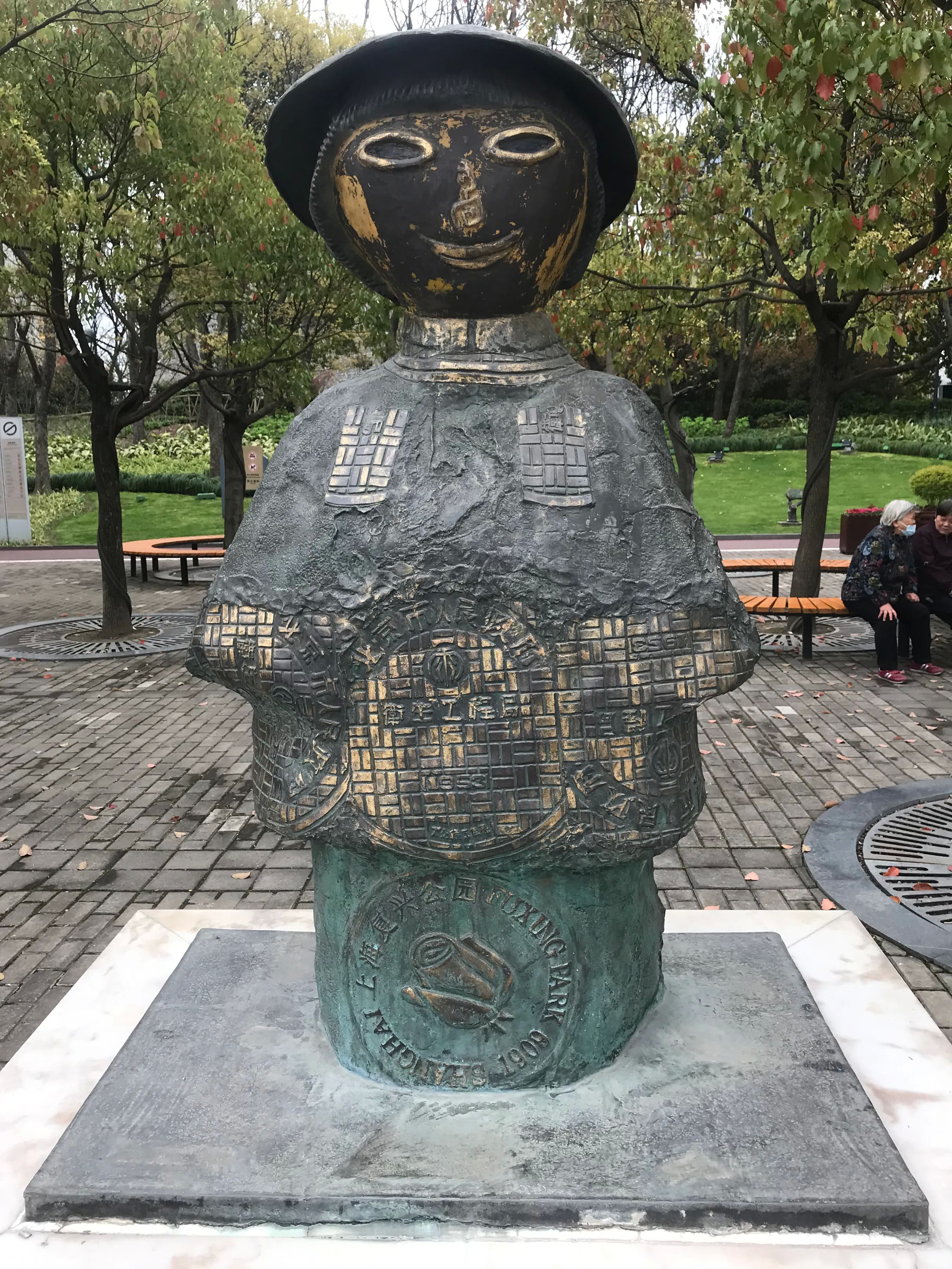 黄浦滨江东岸的白莲泾公园位于白莲泾入黄浦江口边,北接黄浦江、南至世博大道,西起“世博公园•亩中山水园”,东接南码头绿地。上世纪初陆续建起了美商大来码头和民族资本中兴码头。1950年由中国政府征用,改名白莲泾码头。1958年起白莲泾码头与中兴码头正式划归港务局。成为华东地区木材集散储运中心、上海港木材装卸专业码头。为了配合世博会的建设,2006年6月,白莲泾码头停止装卸作业,成为上海世博园规划用地。2010年世博会期间改建为世博M2码头。世博会后经改造成为黄浦江公共旅游码头。2018年,码头结合黄浦江两岸公共空间贯通工程实施进行了再度提升改造。白莲泾公园的亲水平台是一片开阔的滨江空间,青石板铺地,视线很开阔,江面也显得很开阔,往南望去,江对面当代艺术博物馆的大烟囱高高耸立,东边不远处的南浦大桥雄伟伫立,陆家嘴的三件套也在一群高楼间露出了高高低低的头。这里还有一排共计21个雕塑,这些雕塑来自法国艺术家瑞切德•凯莫,名为《世界儿童》,21件雕塑寓意21世纪,在2010年值上海世博会之际赠与中国。这些雕塑作品正面看是立体的,背面看是中空的,像是被剖开的套娃。娃娃的造型简朴,身上布满了来自不同国家、城市的窨井盖、铺路石组成的装饰图案。例如一个梳着丸子头,戴顶小圆帽的娃娃身上,有写着“北京市人民政府”和”上海复兴公园“字样的窨井盖,肩胛处还有两块”弹格路“图案。这一看就应该是”中国儿童“了。