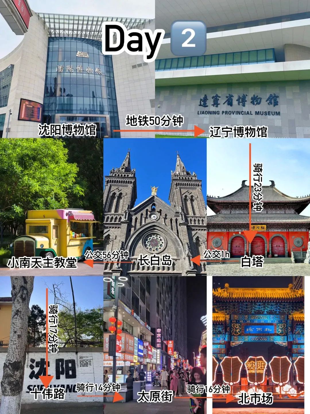 沈阳博物馆开启文化探寻的一天,随后移步辽宁省博物馆,免费但要提前预约,馆内wifi、存包服务贴心,6号7号瓷器展馆值得细细品味。小南天主教堂免费开放,台阶、观景台随手一拍都是大片。在文化路、长白岛森林动物园等地漫步,晚上到太原街、北市场感受城市夜生活。