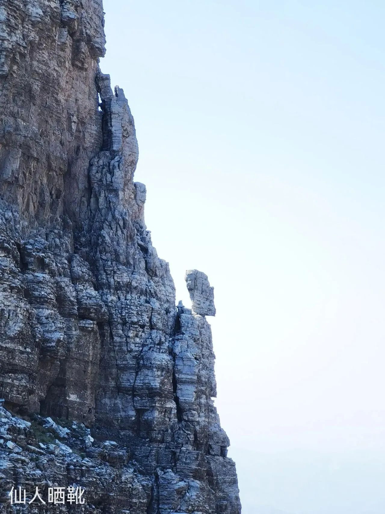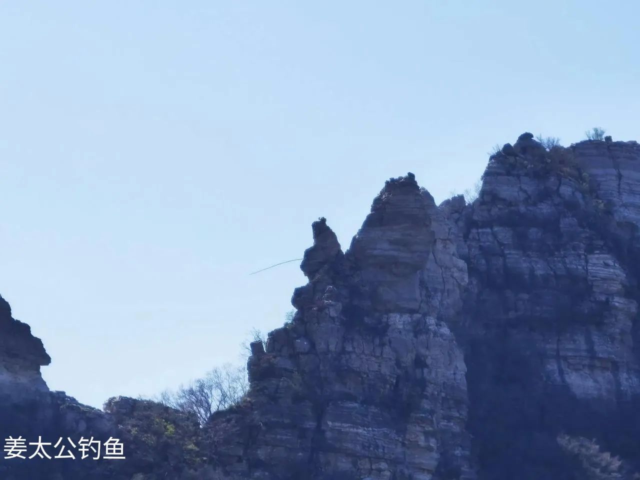有块靴子样的石头,悬挂在山腰,我姑且为其命名:仙人晒靴。还有远远望去如一对恋人依偎而坐,忘情于山水间,天长地久。尙有姜太公钓鱼石,人为的插上一鱼竿,更加传神。