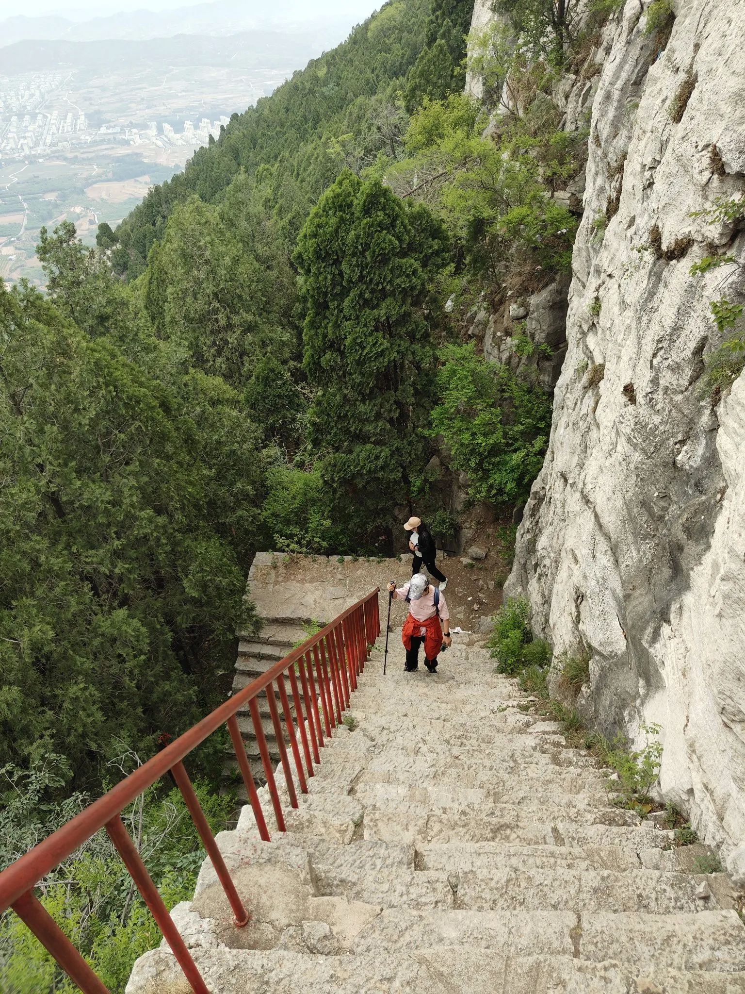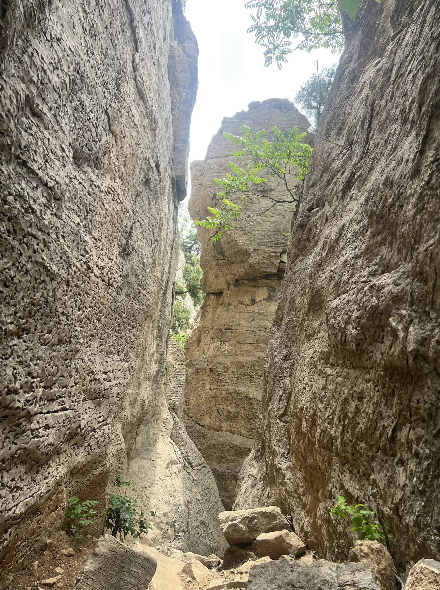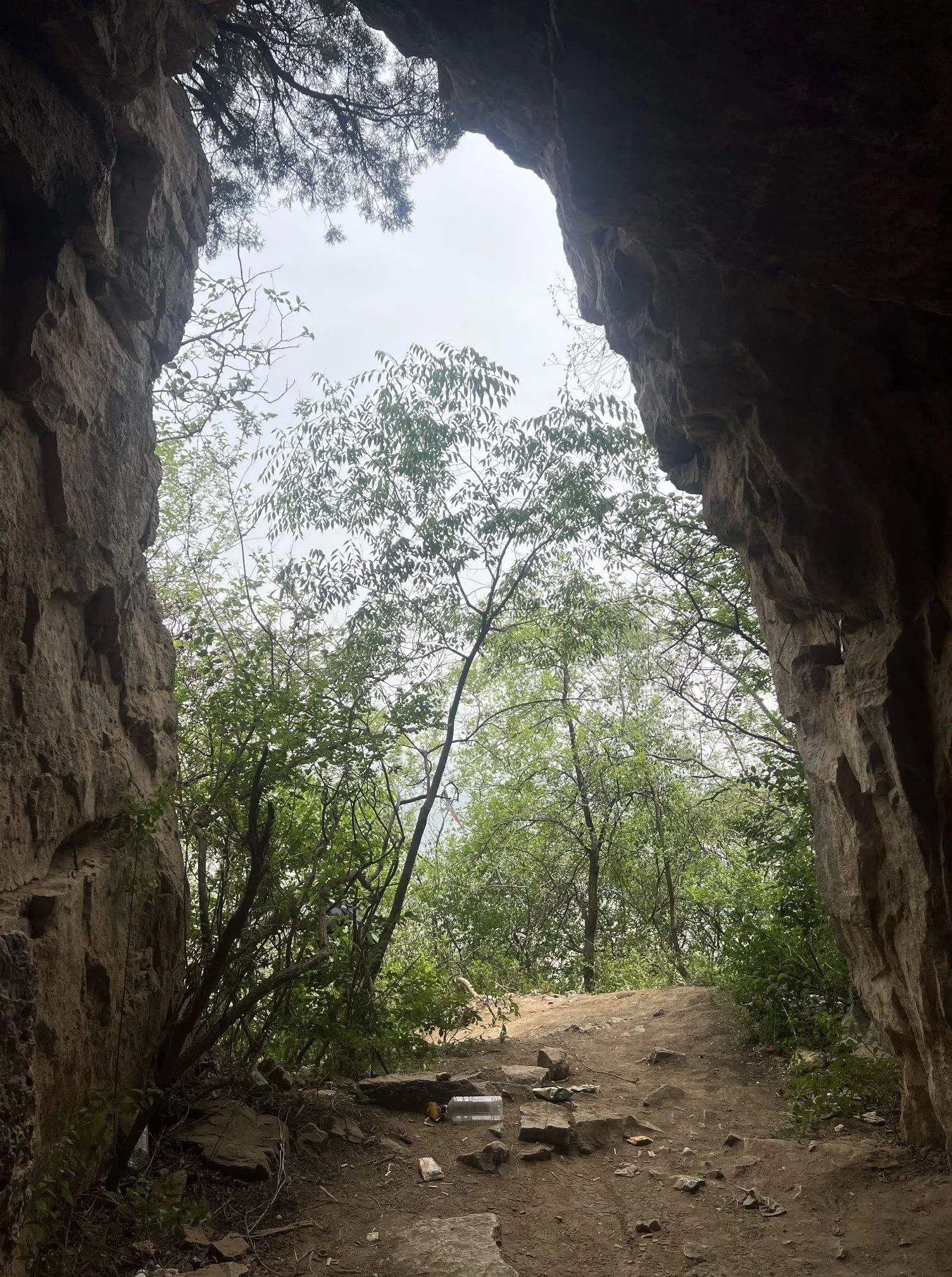早上起来,天有些阴沉,天气预报说济南地区阴有阵雨,带好了雨衣,以防万一。因为今天路途远点,司机师傅又不太熟悉路,到达马山山下的停车场的时候已经十点半多了,领队带我们抄了小路进山,不一会儿就到了半山腰的第二停车场,从这里开始上山,一路都是石板砌的台阶,整齐规整,路边植被茂密,古树参天,还设有垃圾桶,有景点简介和指示牌,有一种仿佛进入景区的感觉。半山腰有鬼谷洞、鹰嘴石、一线天等多个景点,可选择性游玩。