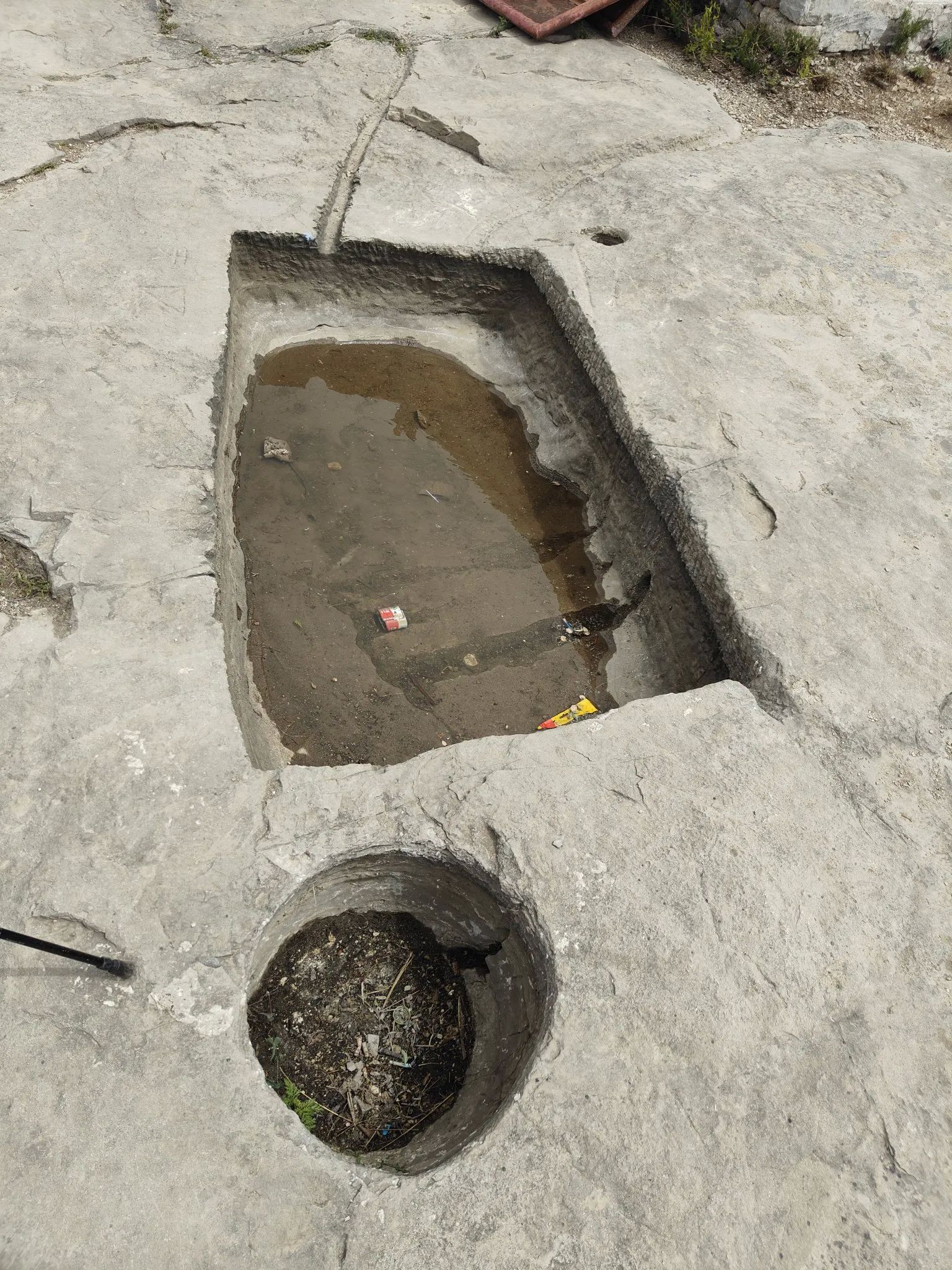 山不是很高,强度也不大,一个多小时就爬到了山顶,山顶保存有众多庙,殿,古建筑群,据记载始建于唐宋,明清鼎盛。马山古为道教盛地,也是风景优美的游览胜地,有“马山之胜在山顶”之说。山顶青石上凿有两个水池(图10),小的是圆形能盛水数十斗,大的是长方形能盛水数百斗,系道士“凿岩石蓄雨水以备饮者”。站在马山山脊凭高望远,悬崖峭壁,壁立壑仞,鬼斧神工,看山下,山峦叠嶂,群峰错落,气象万千。