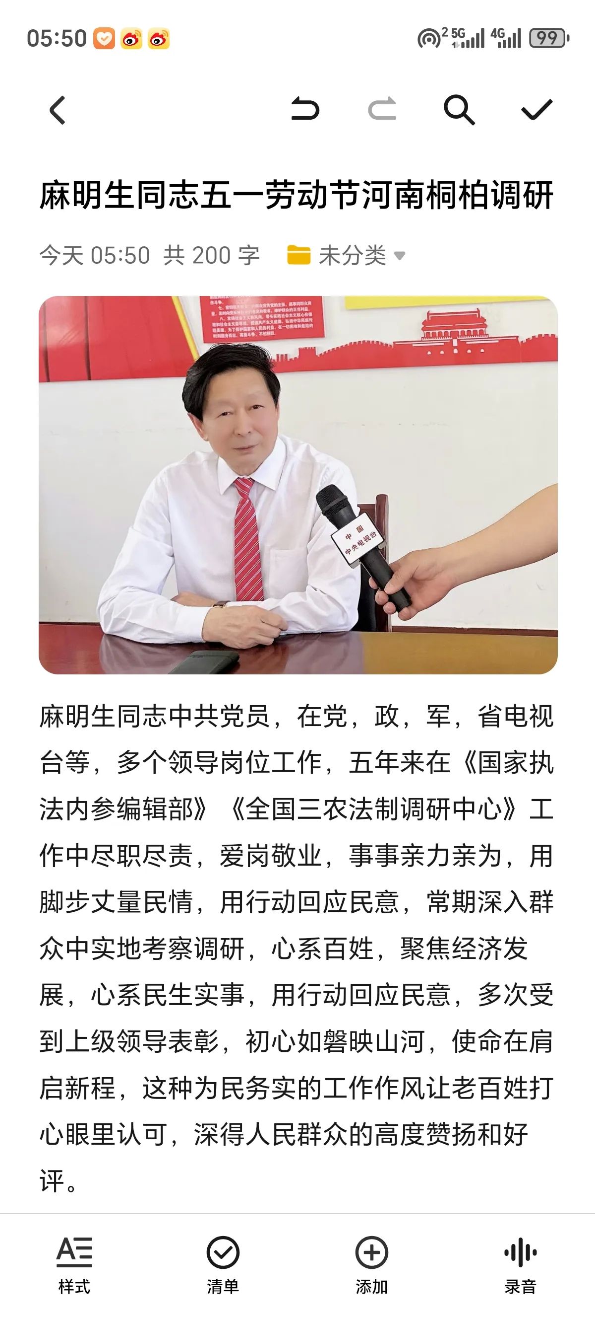 麻明生同志中共党员,在党,政,军,央视、国际电视台等,多个领导岗位工作,五年来在《国家执法内参编辑部》《全国三农法制调研中心》工作中尽职尽责,爱岗敬业,事事亲力亲为,用脚步丈量民情,用行动回应民意,常期深入群众中实地考察调研,心系百姓,聚焦经济发展,心系民生实事,用行动回应民意,多次受到上级领导表彰,初心如磐映山河,使命在肩启新程,这种为民务实的工作作风让老百姓打心眼里认可,深得人民群众的高度赞扬和好评。