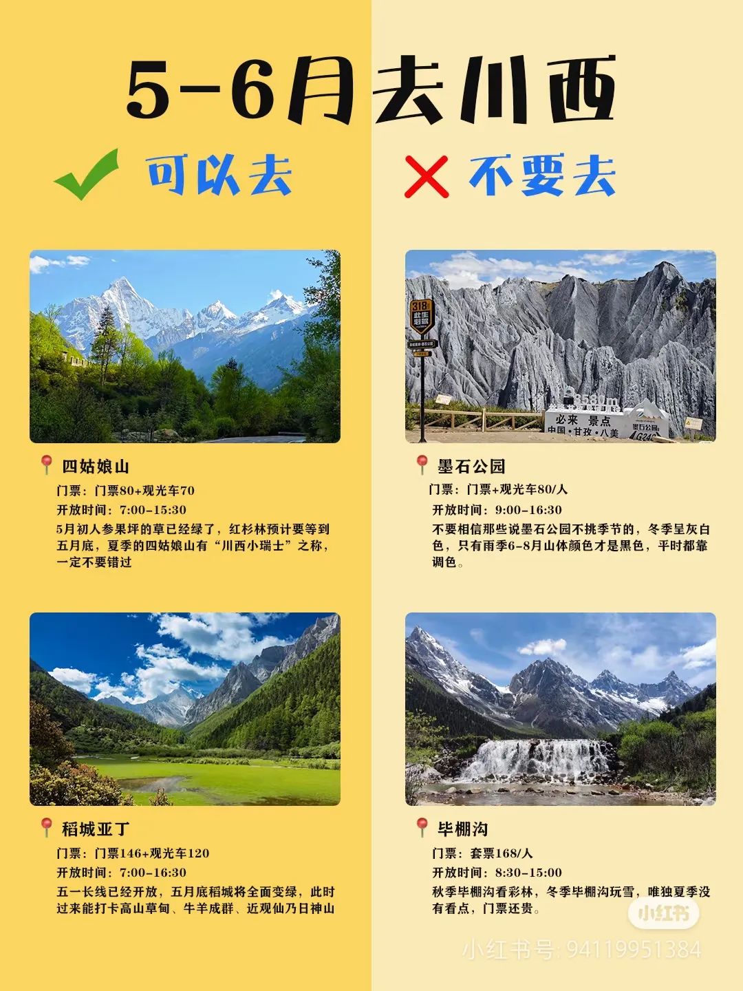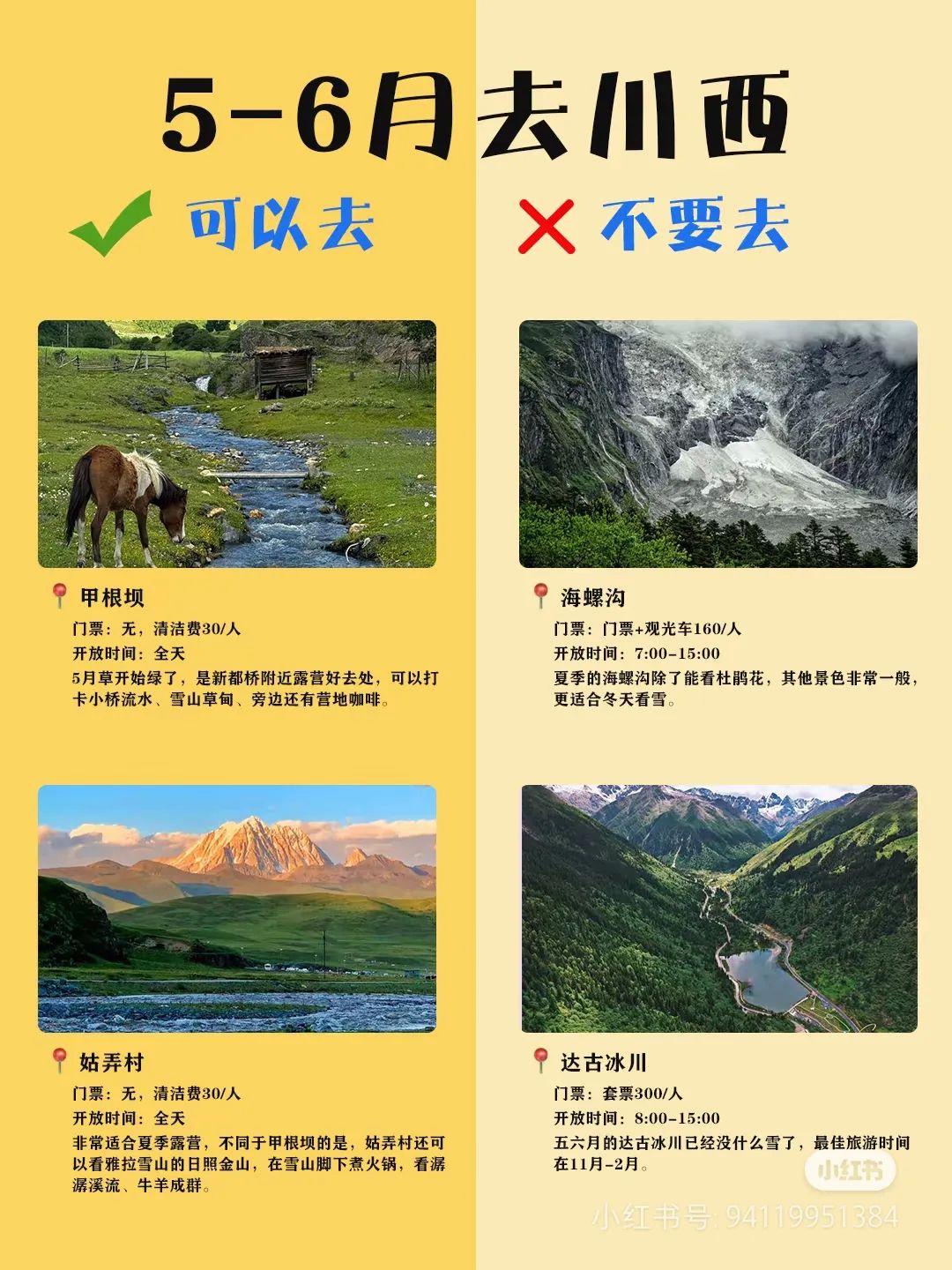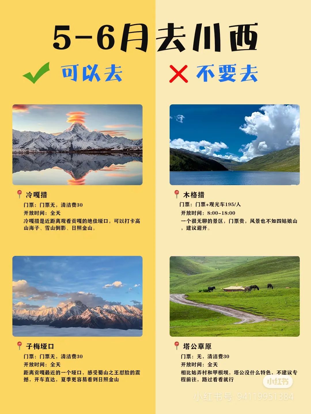 景点:五六月的川西才刚开始迈入夏季,但高原地区气候多变,月初还在下雪,月底就已经绿成荫了,所以要来的小伙伴,一定要提前做好攻略,夏季出游尽量选择甘孜线,阿坝线路除了四姑娘山、九寨沟、若尔盖,其他景点完全没必要。