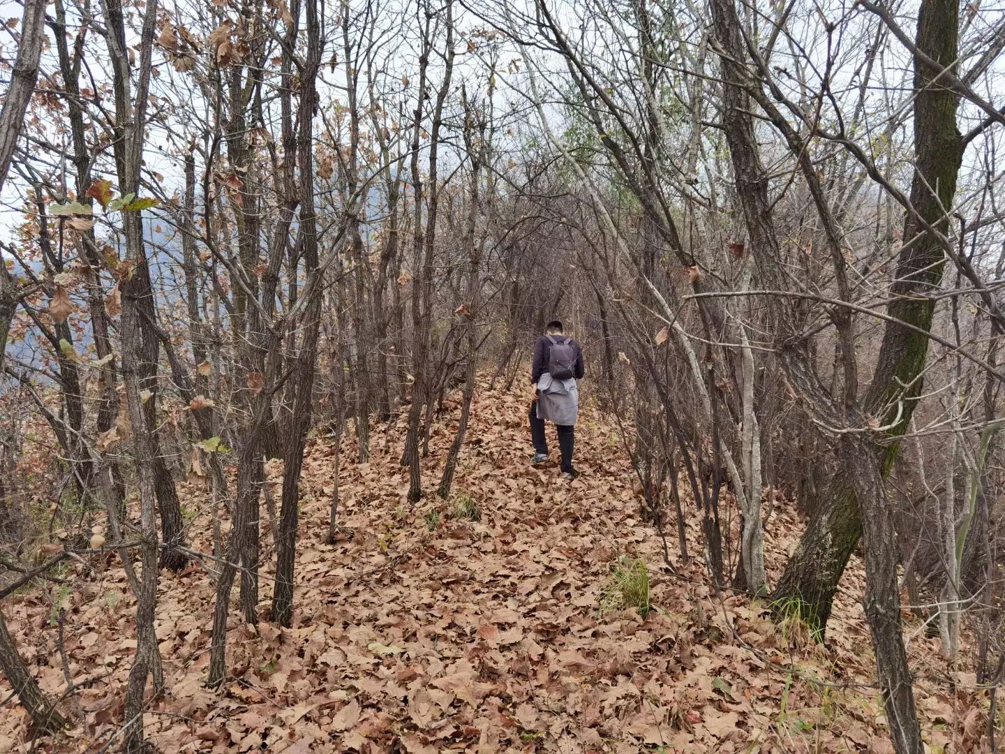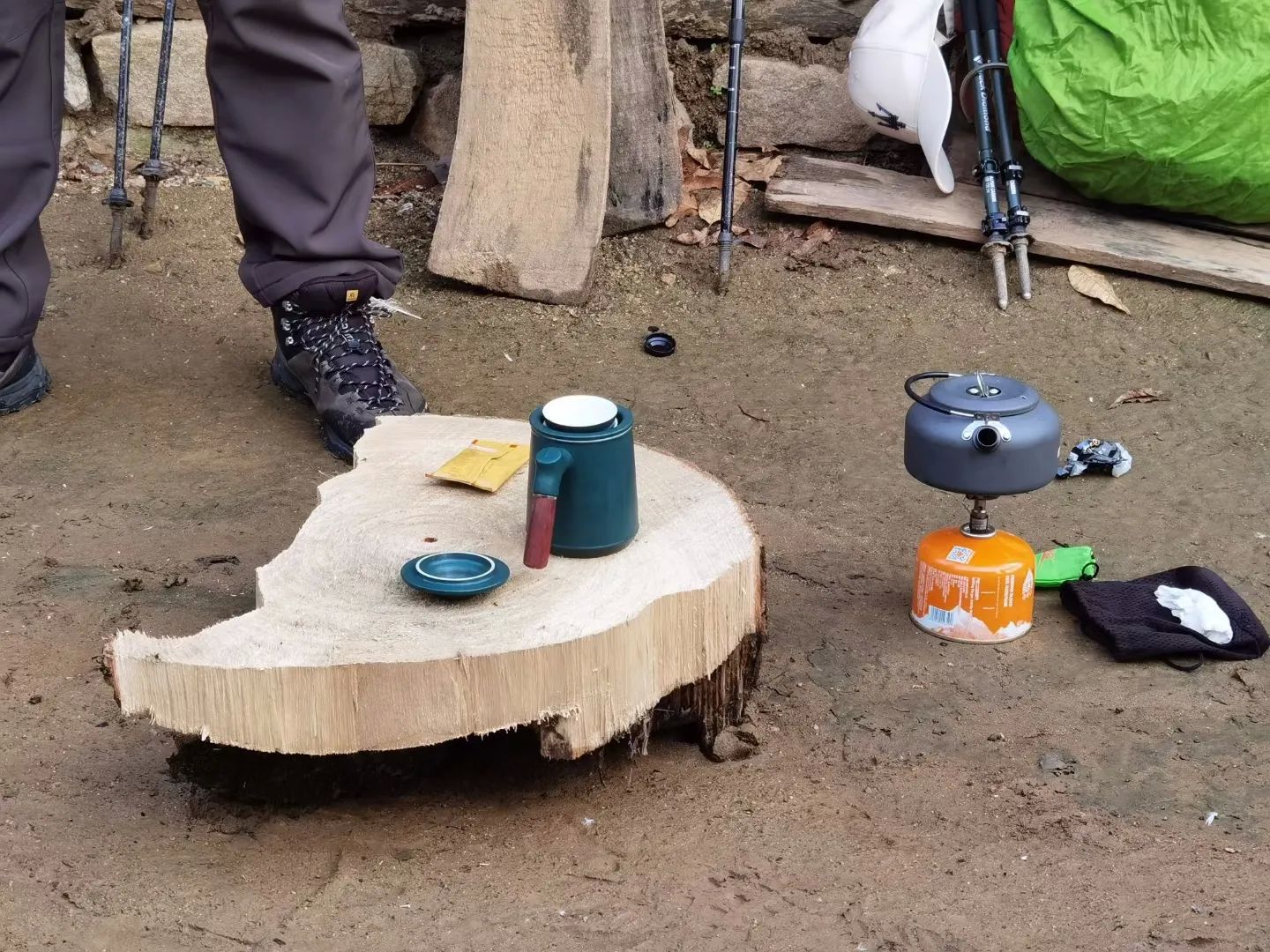 过了这里,我感到还前行了大约两倍的距离才选择了原返。此后上行基本没有河谷,就是沿着一面山坡拔高,很久以后到了山顶一块平地,看状况,似为一个庙宇遗址。胡辉说这里应该是大家叫的黄龙庙吧?!旁边有一个磨盘垒成的桌台,散落一些石柱、原木,有几个更早上去的驴友在此用餐。看看时间尚早,我们继续从此沿着山梁行走,基本没有什么路迹,就在一层厚厚的落叶上深一下浅一下的探路。过了一会胡辉说,这上面再走也没有啥了,大家下去吃火锅吧,我们就回到了石磨盘那里。原来在此的那几个人也早早离开了。段航他们就拿出火锅的一应材料和灶具,架在磨盘石上开始烧火做饭,我开玩笑的说:“你们真会选地方,带的火锅都是有人提前给你们把桌子支好了!”
