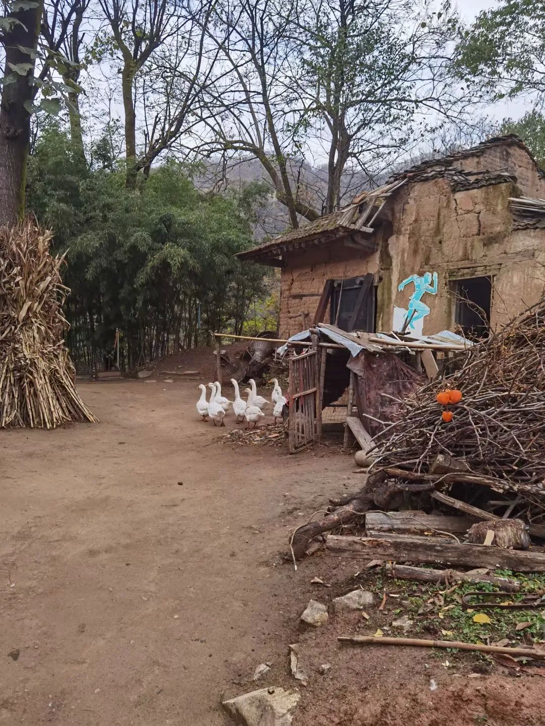 大约爬了一小时多吧,就到了一户农家位置,从农家田边的埂上而过就到了院子,左右两边各有土房几间,院子干干净净,四周有菜地,还有种粮食作物的田地。虽居山间,田舍布局错落有致,院子干干净净,柴火堆积屋檐下,烟囱青烟袅袅,虽有多名驴友在此歇息聊天,也不觉得噪杂,院子后面的鸡鸭篱笆禁足,偶因夺食在里面叽叽喳喳的叫个不停,一个大爷在独自忙碌着。这其实就是我想要的环境和生活!