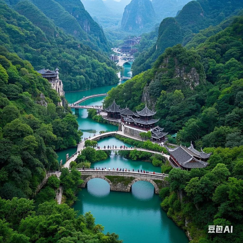 **特色**:喀斯特地貌与碧水交融,被称为“地球腰带上的绿宝石”,景区内古桥、卧龙潭、水上森林等景点如诗如画。秋季碧水映红叶,宛如童话秘境。