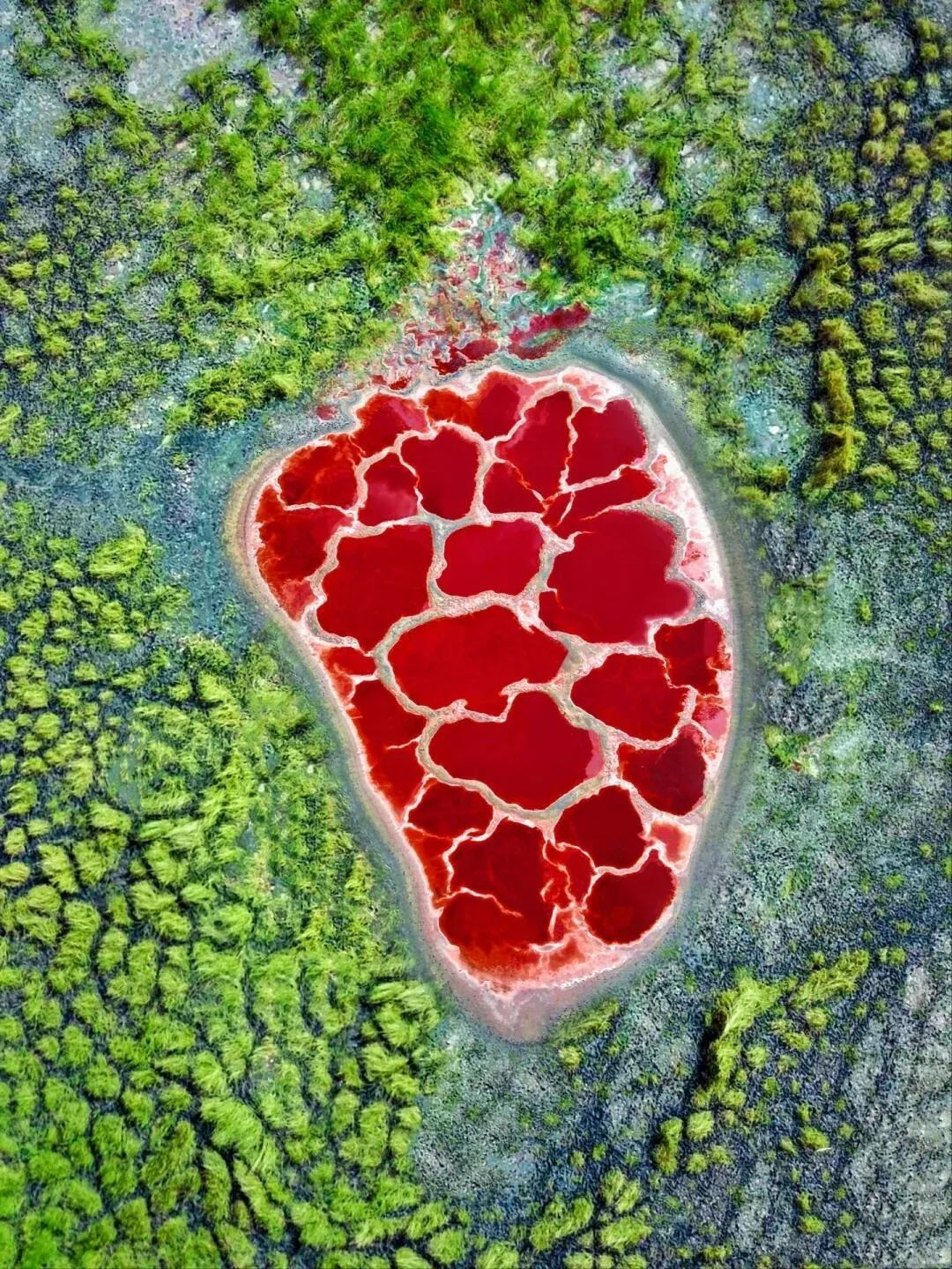 震撼体验:大片玫红色湖水宛如地球跳动的心脏,航拍视角下美到窒息!因位置偏远,建议报一日游团,避开正午强光,清晨或傍晚光线最出片!