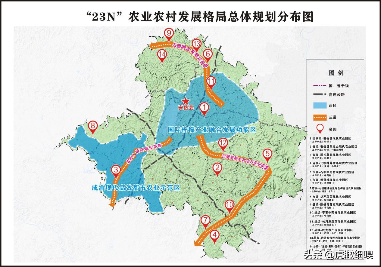 农业:两区三带多园。两区:即国际柠檬产业融合发展功能区、成渝现代高效都市农业示范区;三带:即巴蜀美丽乡村先行区示范带、农旅融合发展示范带、农村人居环境示范带;多园:多个不同级别现代农业产业园。