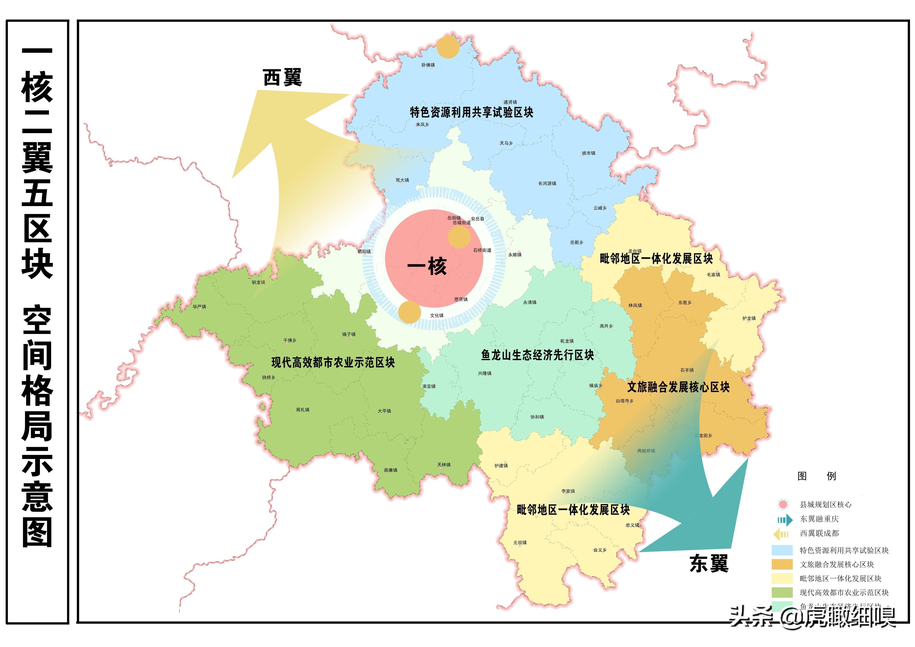 (1)国土空间布局:一核二翼五区块。“一核”:即以县城规划区为核心;“二翼”:东翼融重庆,西翼联成都;“五区块”:即特色资源利用共享试验区块,文旅融合发展核心区块,毗邻地区一体化发展区块,现代高效都市农业示范区块,鱼龙山生态经济先行区块。