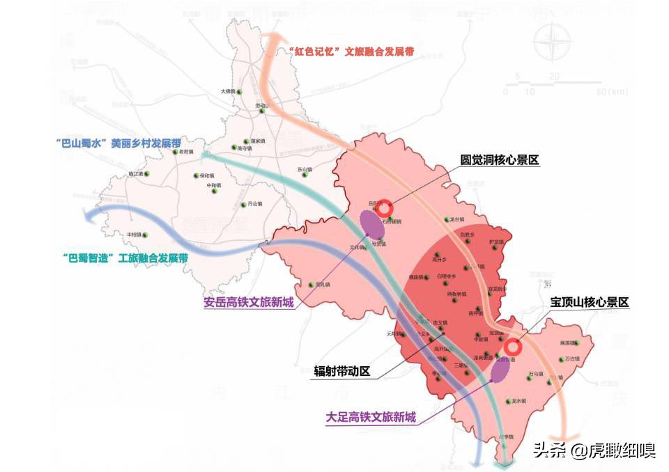 (3)文旅布局:建设资阳大足文旅融合发展示范区安岳高铁文旅新城、圆觉洞核心景区和辐射带动区,共建巴蜀文化旅游走廊。