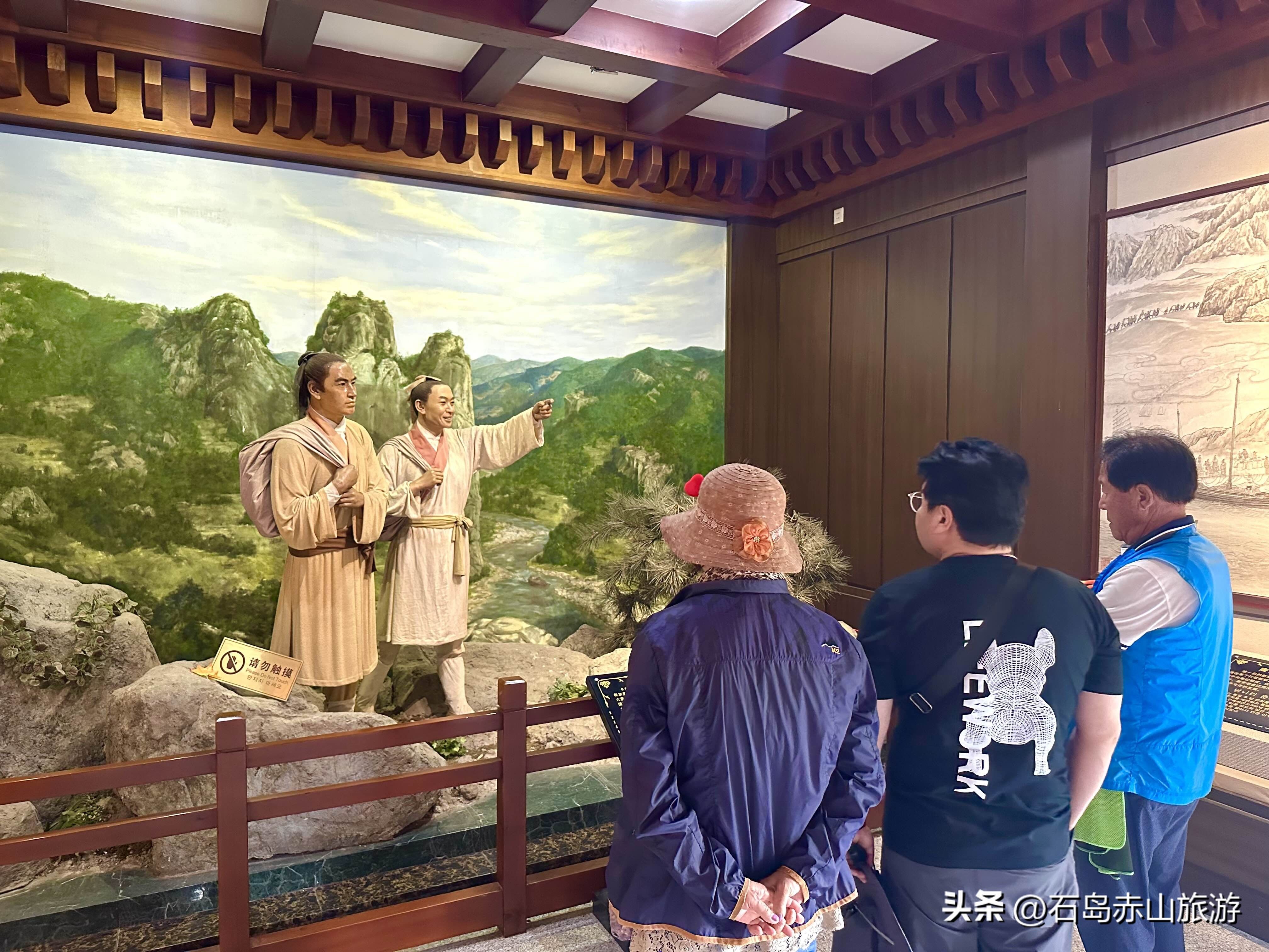 首站登顶赤山明神观景台,俯瞰碧海青山相映成趣;随后漫步吉祥平安谷,音乐喷泉随旋律起舞,水雾氤氲间烦恼全消;最后走进张保皋传记馆,穿越千年历史长河,感受中韩交流的深厚底蕴。午时,游客们带着赤山的祝福与美好记忆满意而归。