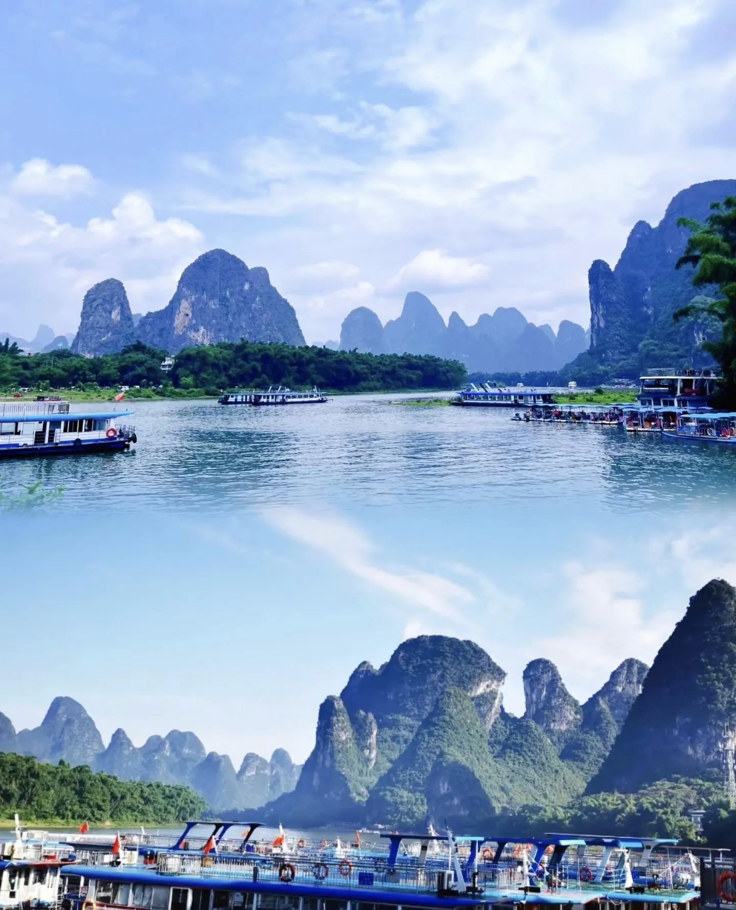 - 上午:从磨盘山码头或竹江码头乘坐游船游览漓江精华段,可欣赏到九马画山等绝美景色,中途在兴坪古镇下船,这里有明清建筑群,还能找到20元人民币背面图案的取景地,拍照留念。