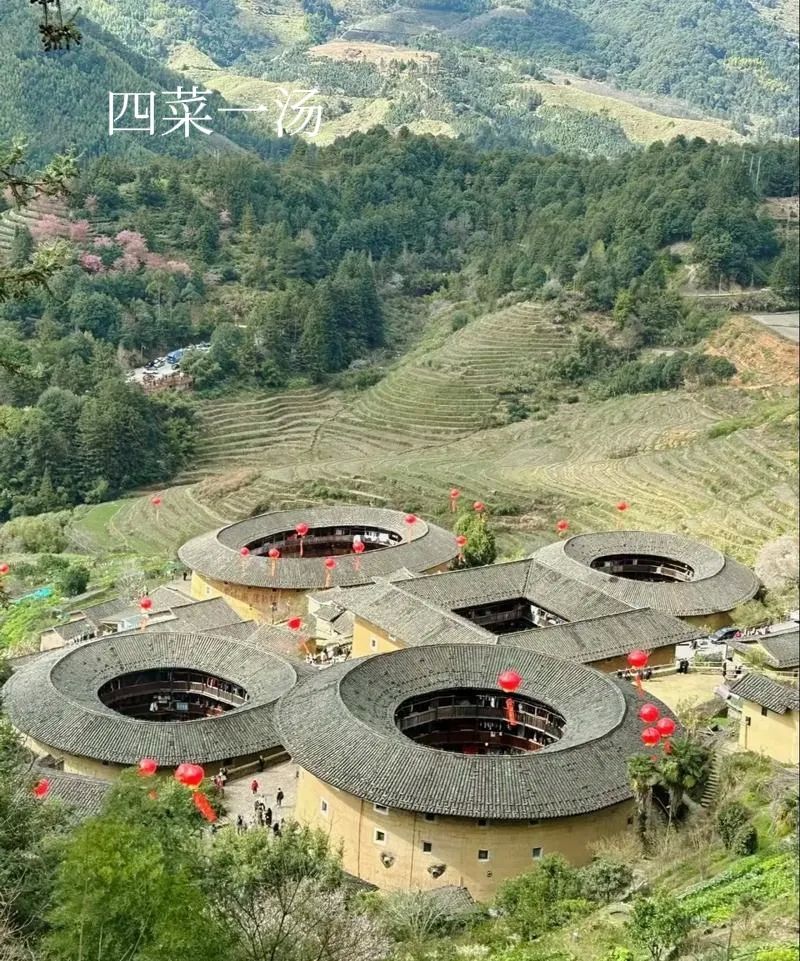 田螺坑:俯瞰“四菜一汤”全景,感受土楼的建筑智慧。