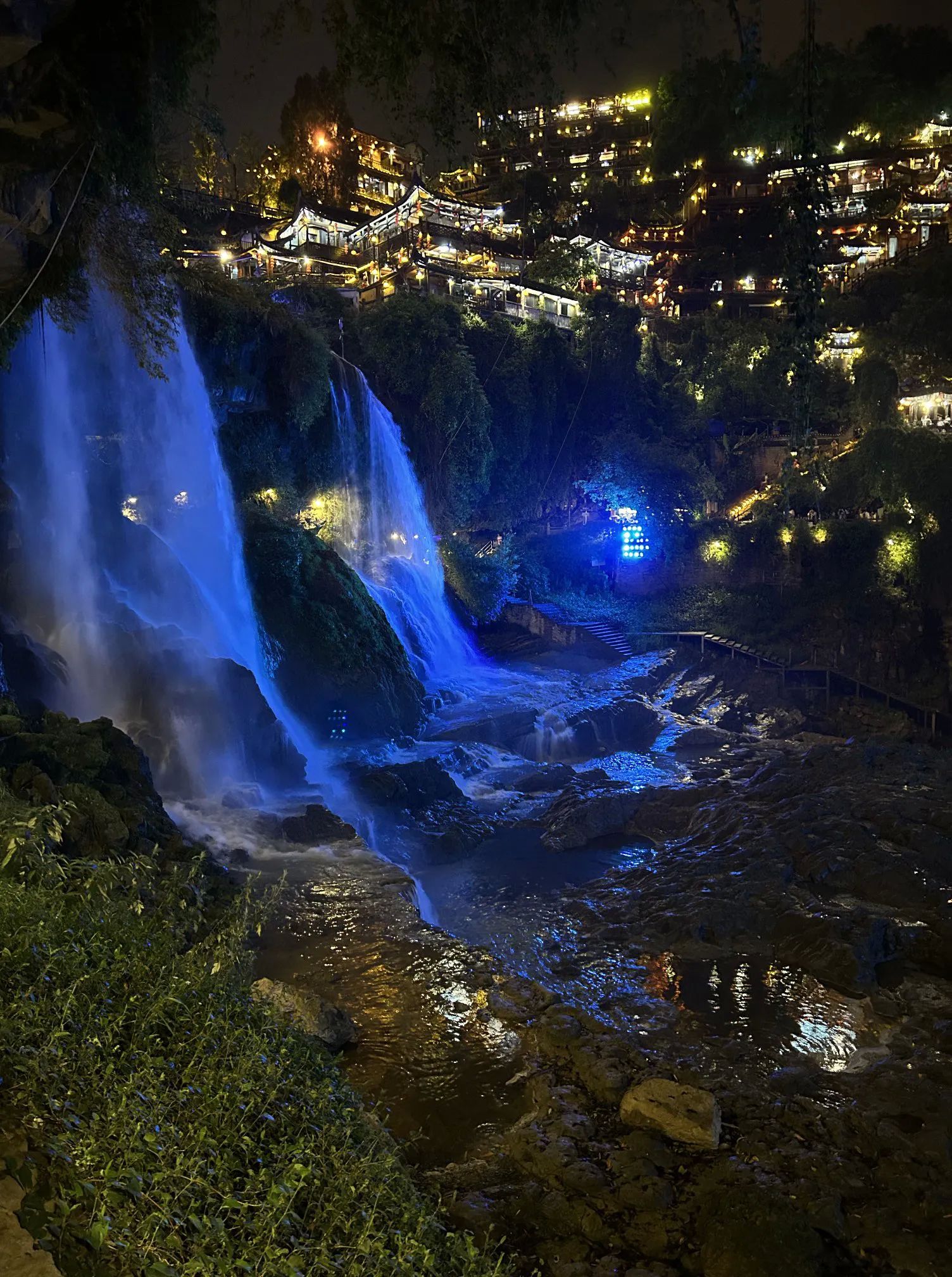 3、芙蓉镇:一定晚上7点以前进景区,有节目观看。看玩节目后,围着芙蓉镇转一圈,可以看到不同角度的瀑布夜景,犹如天上人间,景色很美。