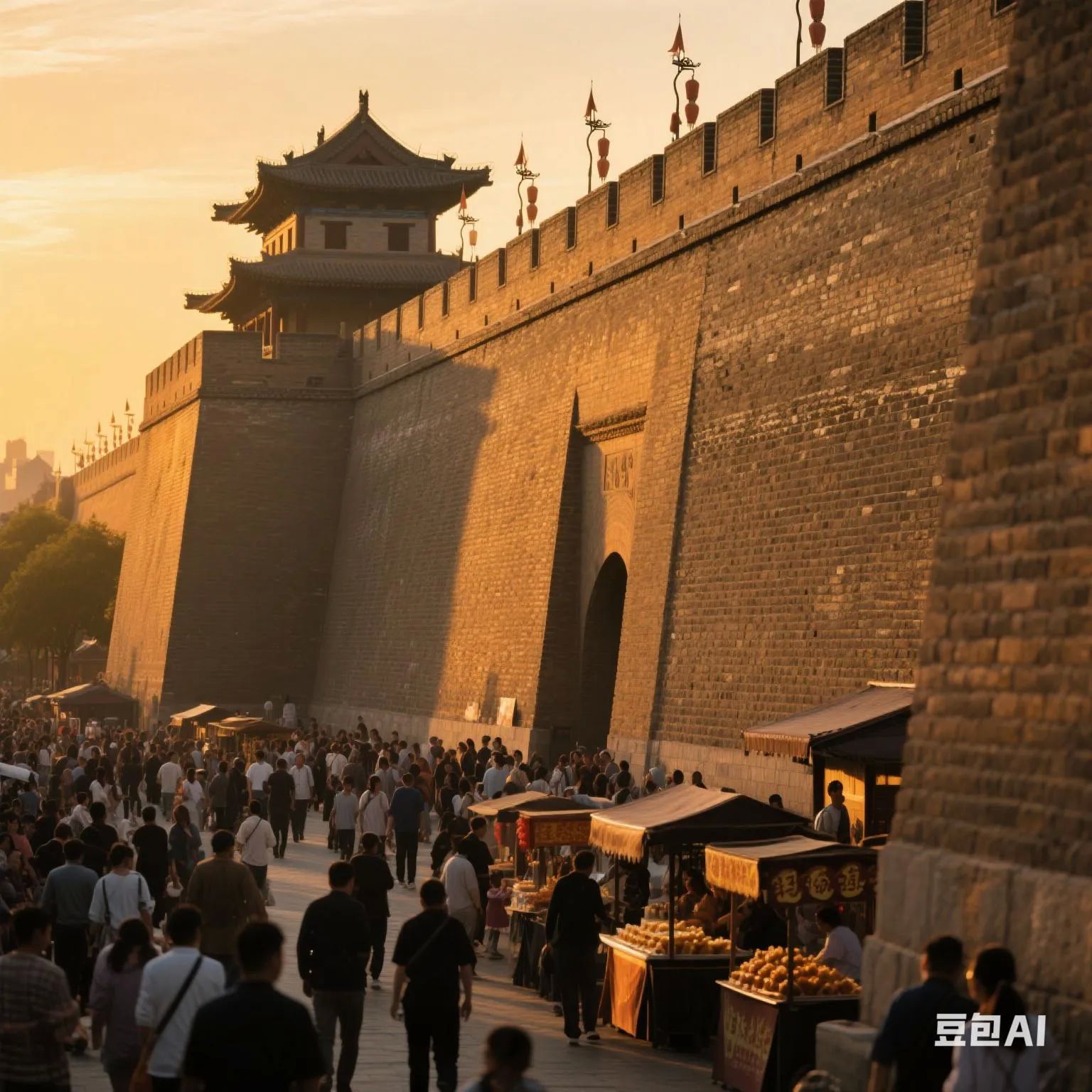 - 下午:参观西安城墙,可选择步行、骑自行车绕城墙一周,感受古城的厚重。城墙设有多个登城口,可就近选择。租自行车单人45元/120分钟 ,双人90元/120分钟。