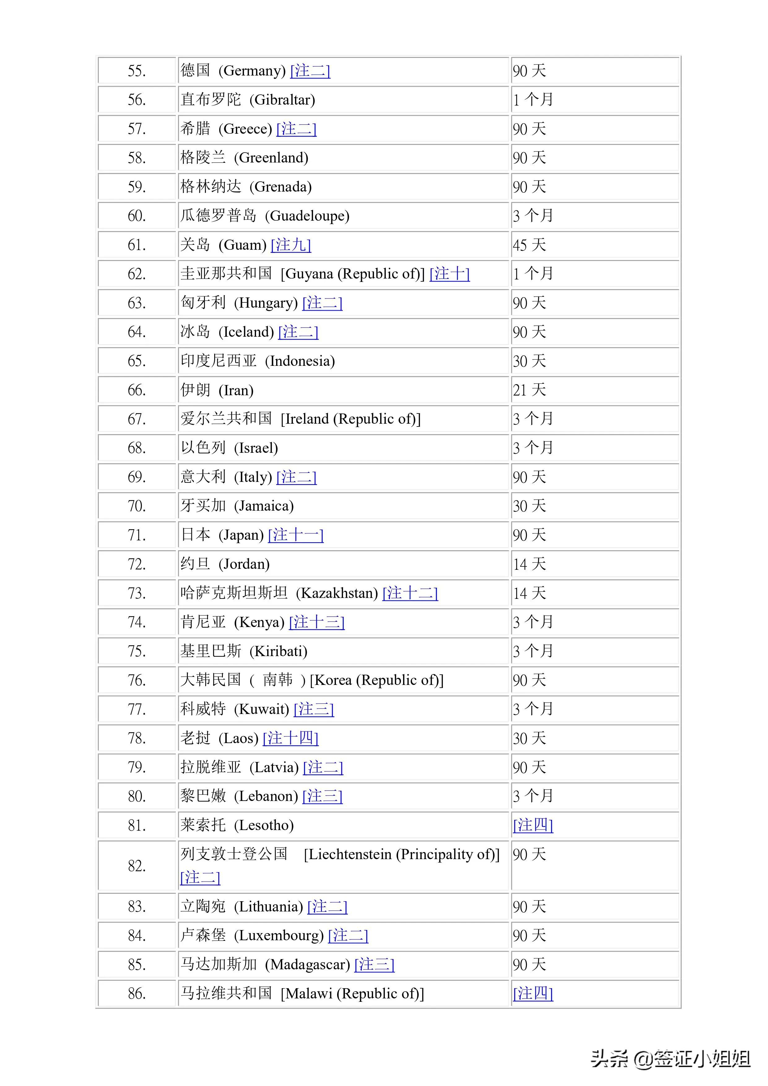 亚洲(27个):日本,韩国,新加坡,马来西亚,泰国,印度尼西亚,菲律宾,蒙古,老挝,缅甸,尼泊尔,哈萨克斯坦,乌兹别克斯坦,土耳其,阿联酋,以色列,约旦,巴林,科威特,黎巴嫩,伊朗,也门,卡塔尔,马尔代夫,亚美尼亚,文莱,东帝汶。