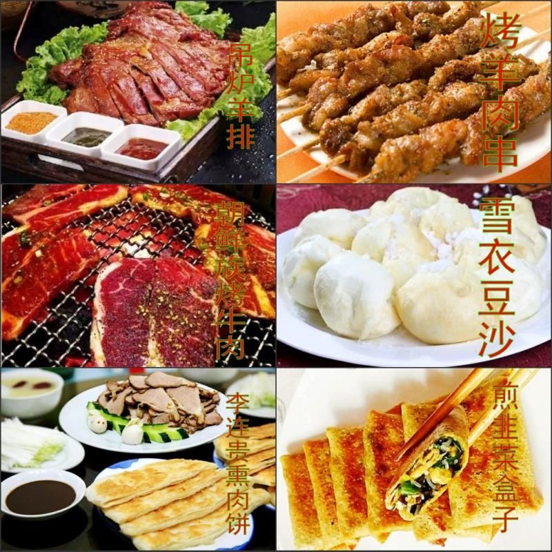 四平主要特色小吃:熏肉大饼、烤羊肉串、血衣豆沙、煎韭菜盒子、烧土豆、玻璃叶饼…。