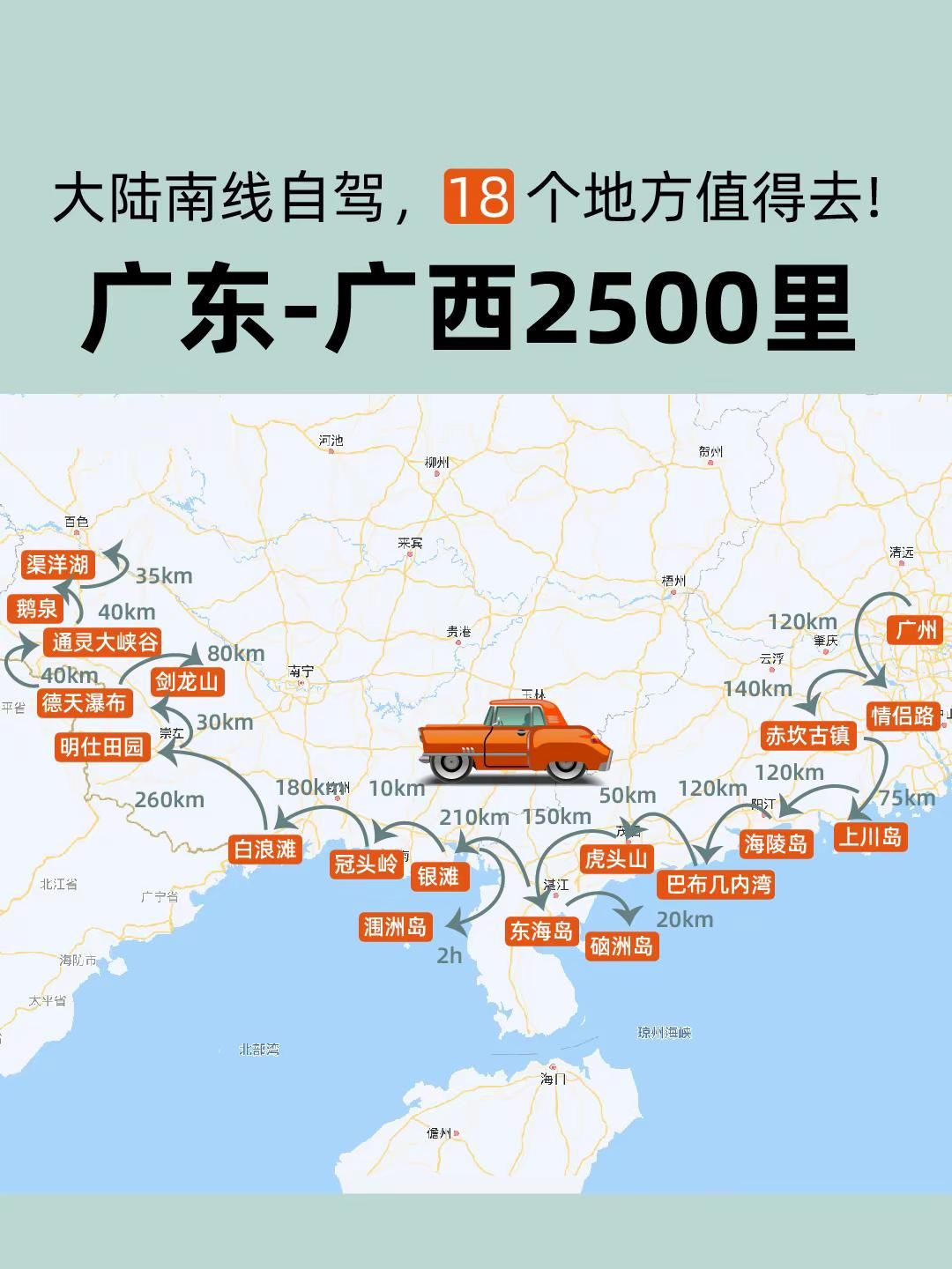 广东-广西,从海景到瀑布,这条路线封神了。情侣路(珠海):珠海浪漫天花板!沿海骑小电驴吹风,灯塔、渔女雕像、爱情邮局,随手拍都是偶像剧画面。赤坎古镇(江门):南洋风情的侨乡老街,骑楼挂着老招牌,煲仔饭和豆腐角香到走不动路。上川岛(台山):人少景美的神仙海岛,风车山配蔚蓝海,沙堤渔港的日落美到词穷。海陵岛(阳江):“中国十大最美海岛”之一,主要打卡点:北洛秘境、马尾岛、十里银滩等巴布几内湾(茂名):本地人私藏的野海滩,人少沙细,躺在吊床上,吹着海风,远眺蔚蓝的大海,特别惬意虎头山(茂名):这里最适合看日出日落,山顶看海视野绝了!边上还有童子湾、晏镜岭、中国一滩,可以一起玩东海岛(湛江):广东第一大岛,28公里长的沙滩,世界第二“长滩”,沙子细腻柔软。硇洲岛(湛江):中国最大火山岛!主要打卡有:灯塔、火山岩黑石滩、海龟城、那晏海石沙滩等。银滩(北海):沙细到能反光!下午躺沙滩椅喝椰子,傍晚来可以免费看橘子海日落。涠洲岛(北海):火山岩、珊瑚礁、天主教堂,可以骑电驴环岛,还有吸引人的“追鲸”。冠头岭(北海):灯塔配礁石很出片,山顶能俯瞰北海城景,边上的流下村很文艺!白浪滩(防城港):沙滩很宽沙子细腻柔软,最适合玩水游泳了,边上的白沙湾、怪石滩很出片!明仕田园(崇左):现实版山水画!《花千骨》取景地,稻田边骑自行车超治愈德天瀑布(崇左):亚洲第一跨国瀑布!坐竹筏冲到瀑布脚下,水雾糊一脸超爽,也可以到山上观景台俯瞰神奇的喀斯特地貌。剑龙山(崇左):野生徒步天堂!手脚并用爬陡坡,海拔不高但视野极佳,一望无际抹茶绿的巧克力山,需要注意安全穿防滑鞋。通灵大峡谷(百色):热带雨林+地下暗河,穿过溶洞看到188米高瀑布直砸下来,很震撼!溶洞里滴水要小心防滑,避开枯水期鹅泉(靖西):德天瀑布的源头,泉水清澈见底,夏天荷花铺满湖面,比较吃天气,建议赶早拍晨雾。渠洋湖(靖西):“广西小千岛湖”!超小众的免费景点,登上岜旗观景亭,全程15分钟可登顶俯瞰全景-从海鲜吃到酸嘢,从海浪追到瀑布,这条路线绝对不亏!#广州周边游 #带你一起去看海 #广东旅游 #自驾游 #我的小众旅行攻略