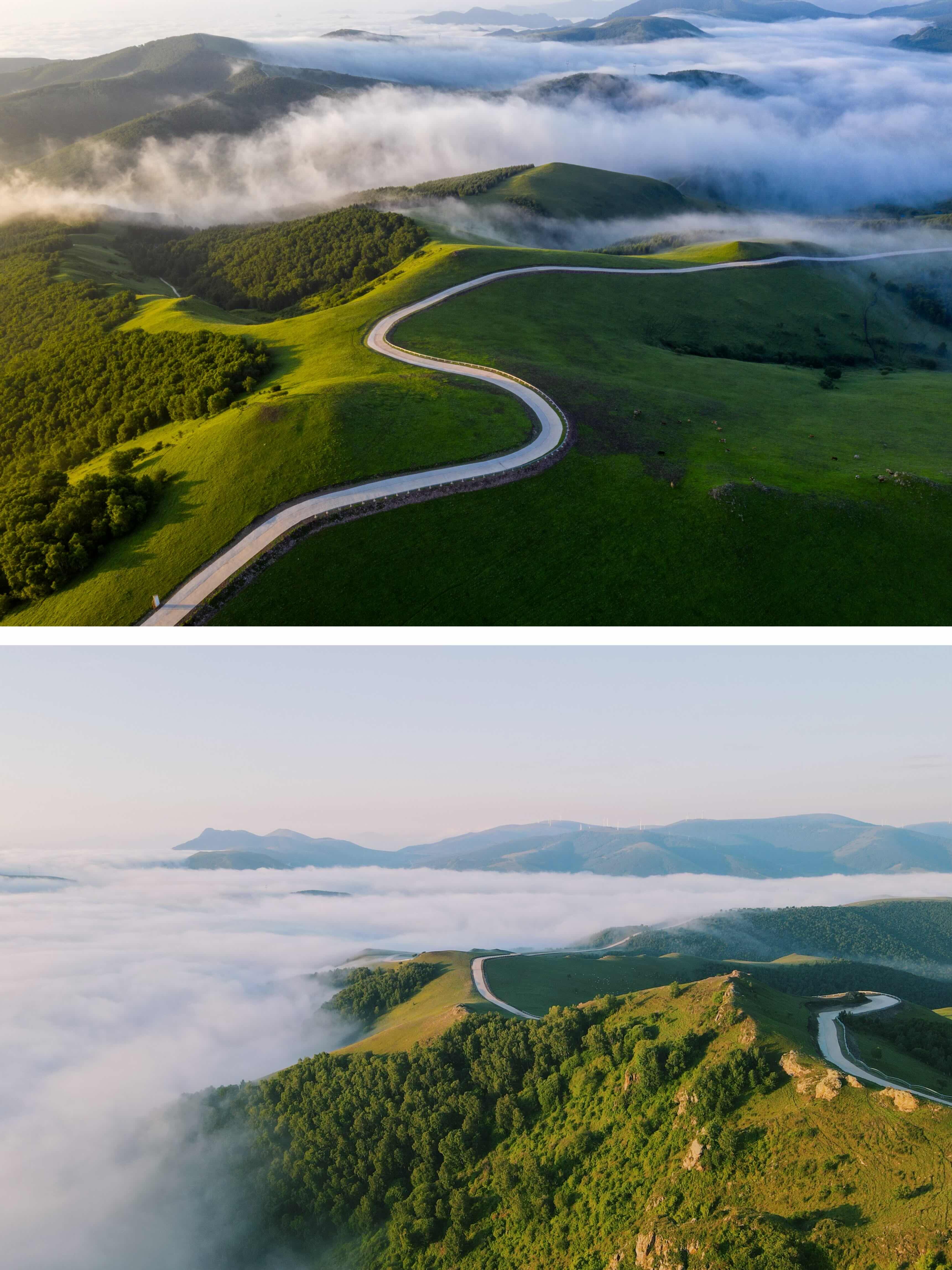 雨后必冲!云雾翻涌缠绕风车白桦林,自驾穿行云端,相机直出魔戒中土世界~日出晚霞+风车矩阵+花海徒步,治愈值拉满!