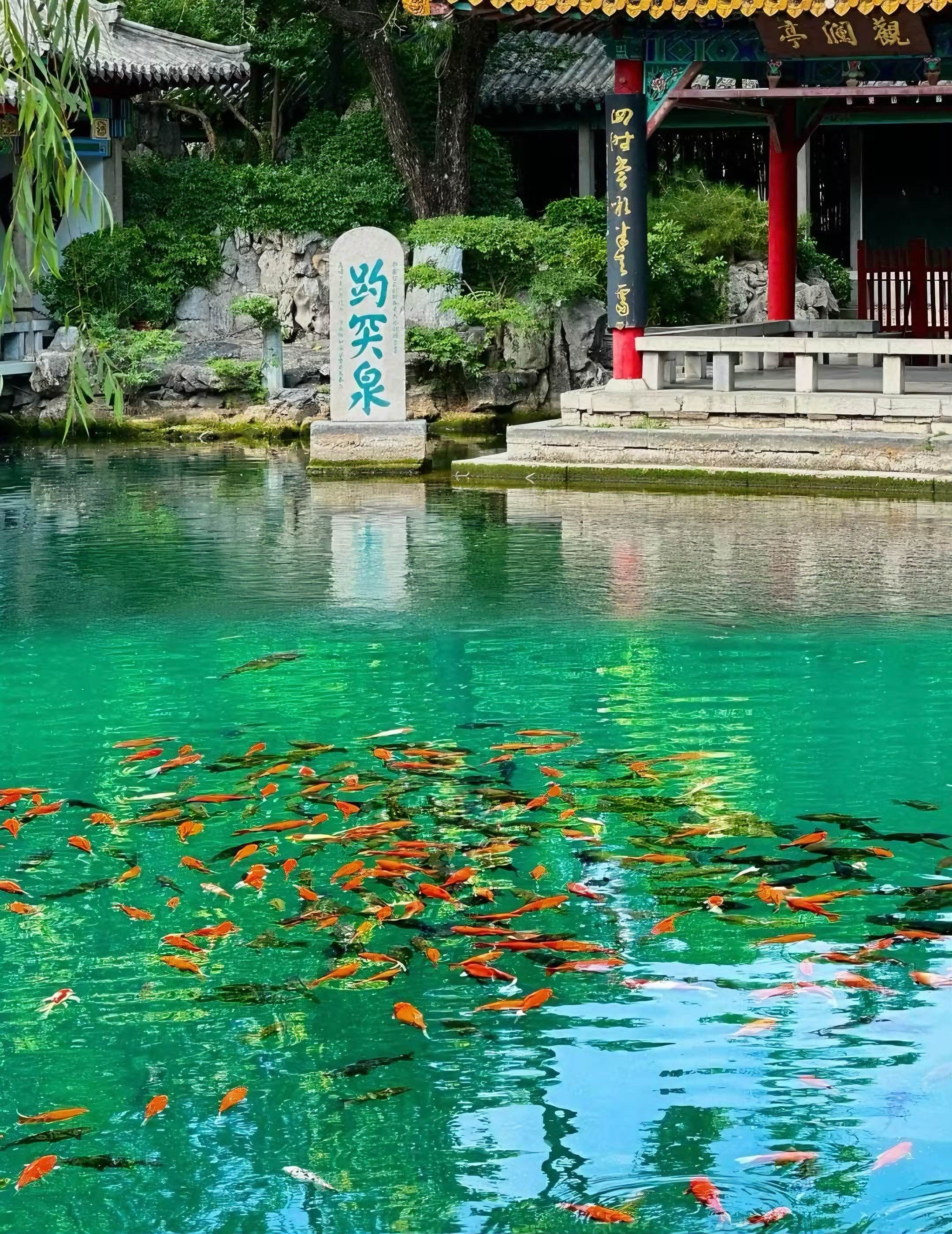 4、泉城济南的水也太清了,趵突泉公园的水清澈见底,里面的鱼真的好肥,一看就没少吃啊。