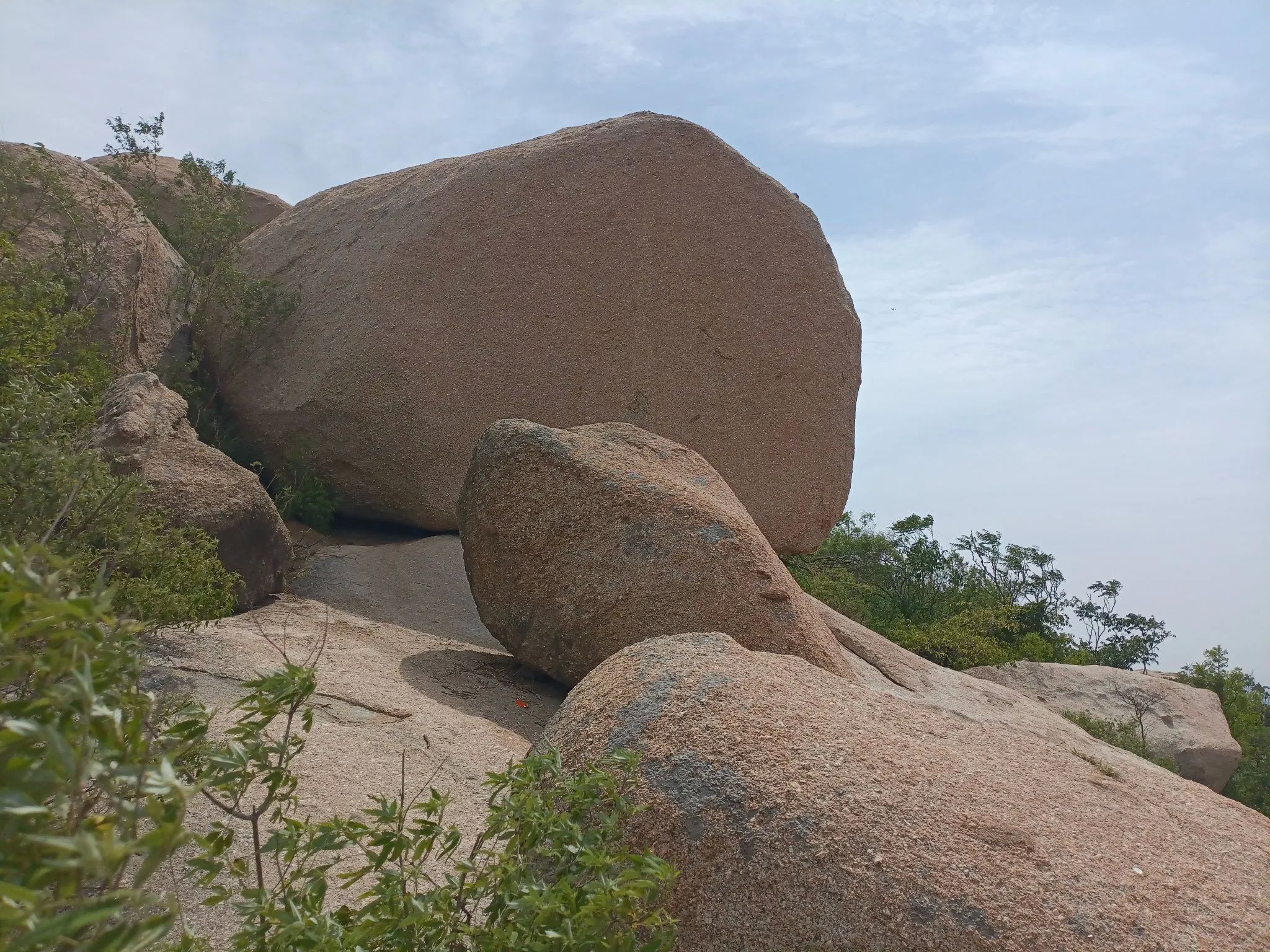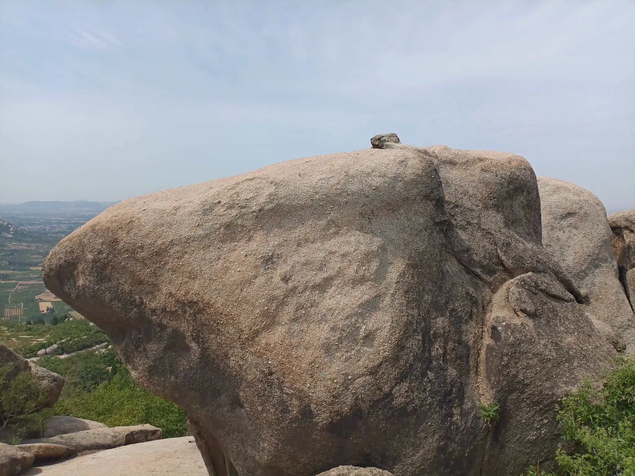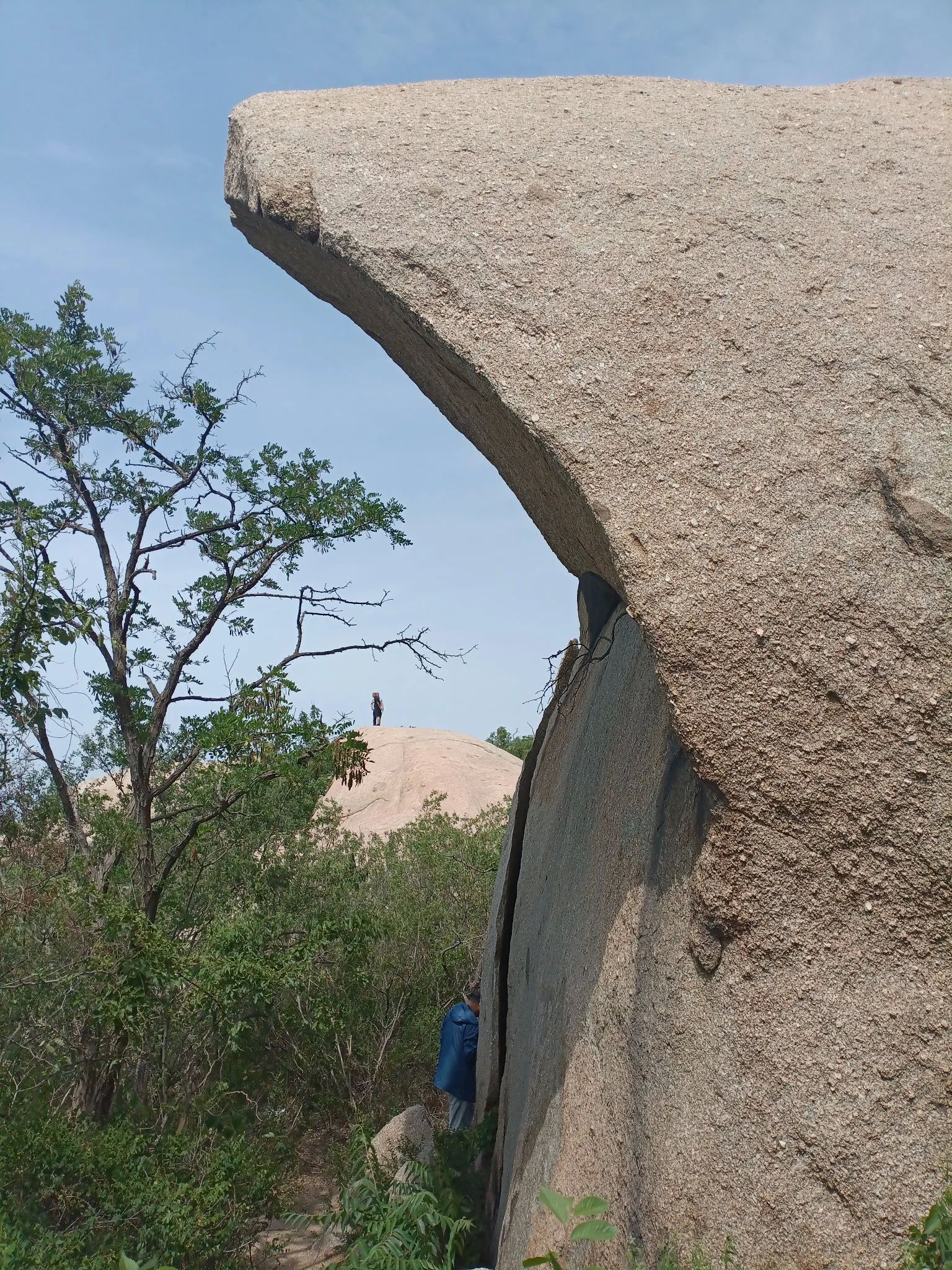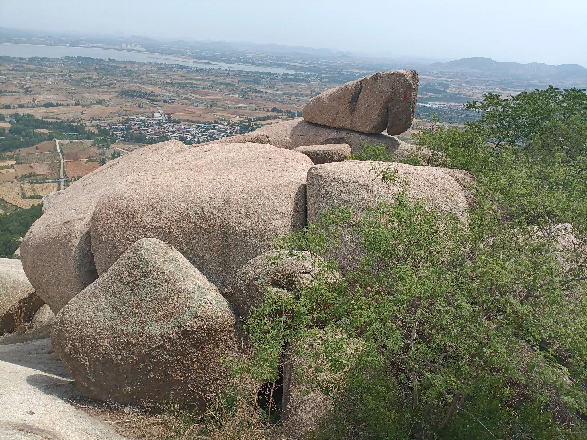 我们从山的北面登山。顺着游人踩出的小路,快速行进,一度十分顺利。有个年轻人甚至抱怨他的一个同伴胆小,这么易登的山却临阵脱逃了。但临近山顶,却被那巨大的石块挡住了去路。我们几人分头行动,试了好几条小道,都不能登顶。明明听到上面有人说话,也看到人家就坐在山顶大石头上,离我们也就二十余步之遥,可我们就是上不去。