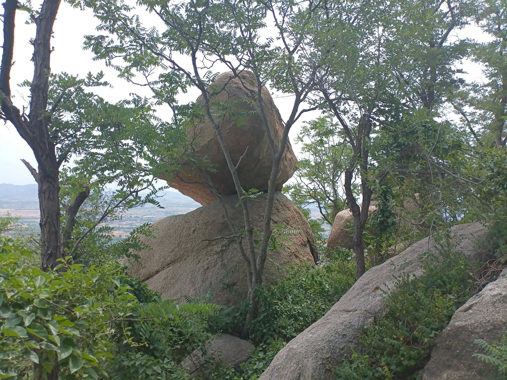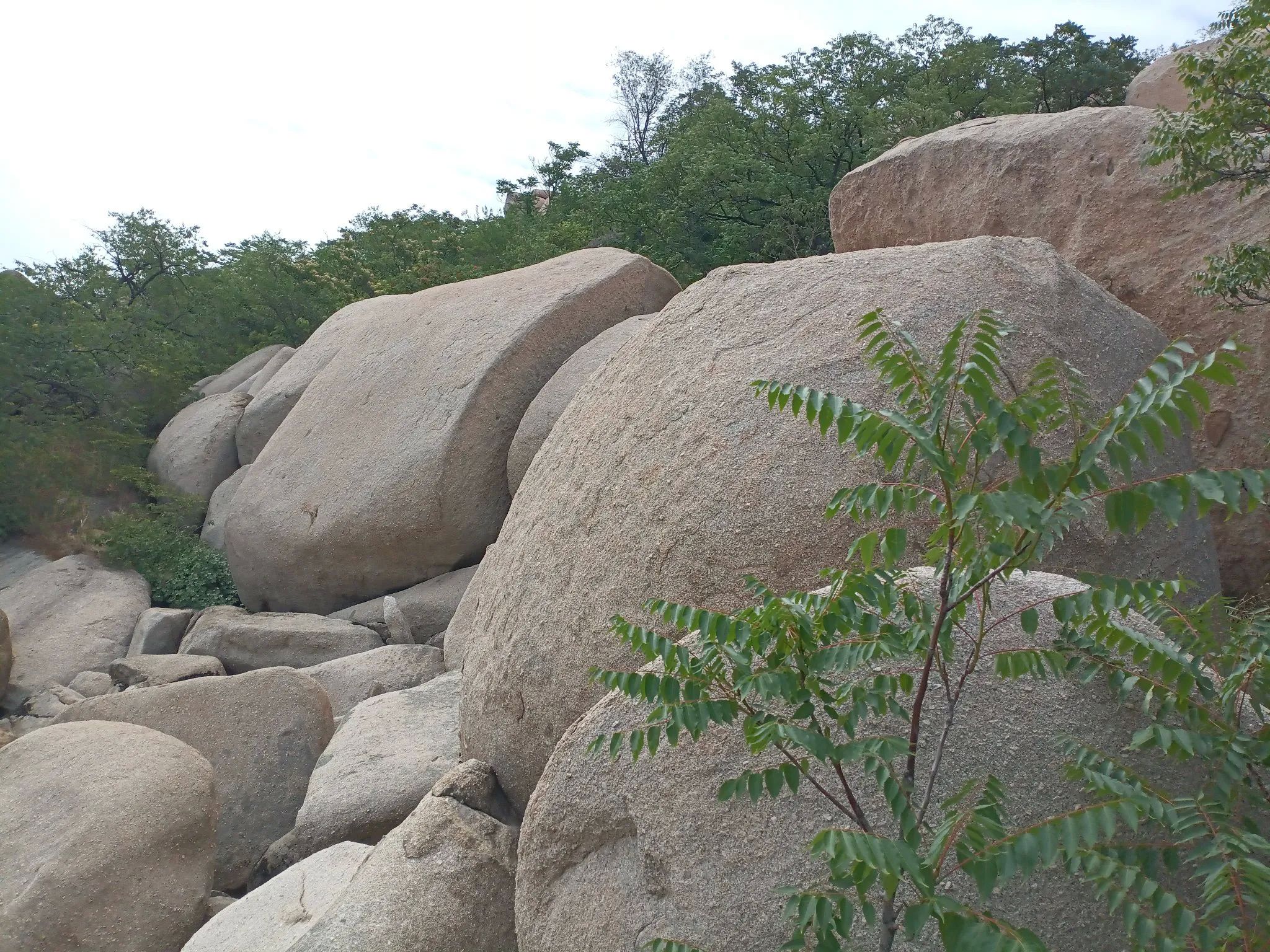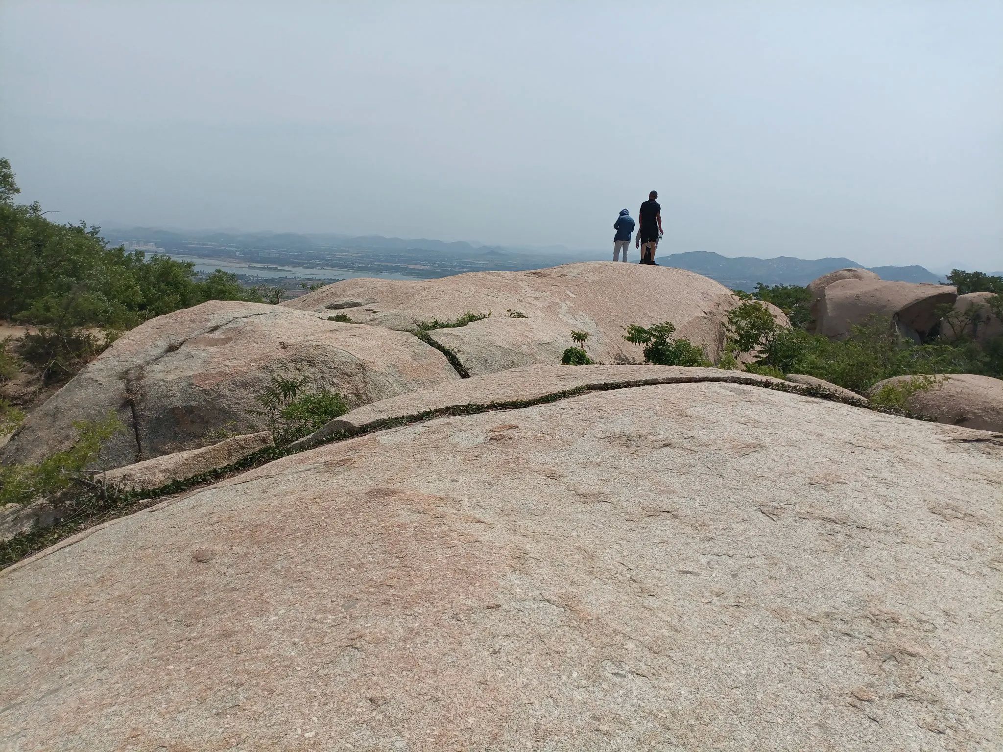 我们从山的北面登山。顺着游人踩出的小路,快速行进,一度十分顺利。有个年轻人甚至抱怨他的一个同伴胆小,这么易登的山却临阵脱逃了。但临近山顶,却被那巨大的石块挡住了去路。我们几人分头行动,试了好几条小道,都不能登顶。明明听到上面有人说话,也看到人家就坐在山顶大石头上,离我们也就二十余步之遥,可我们就是上不去。