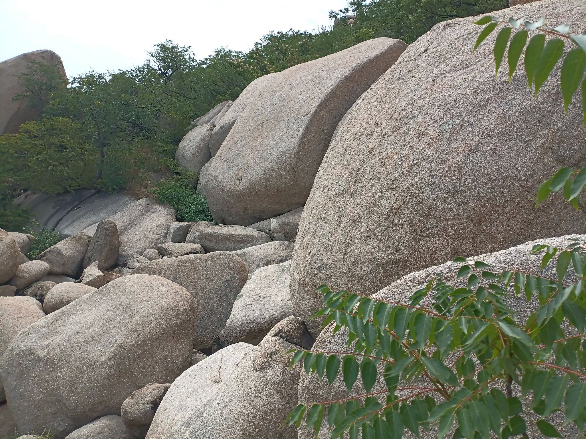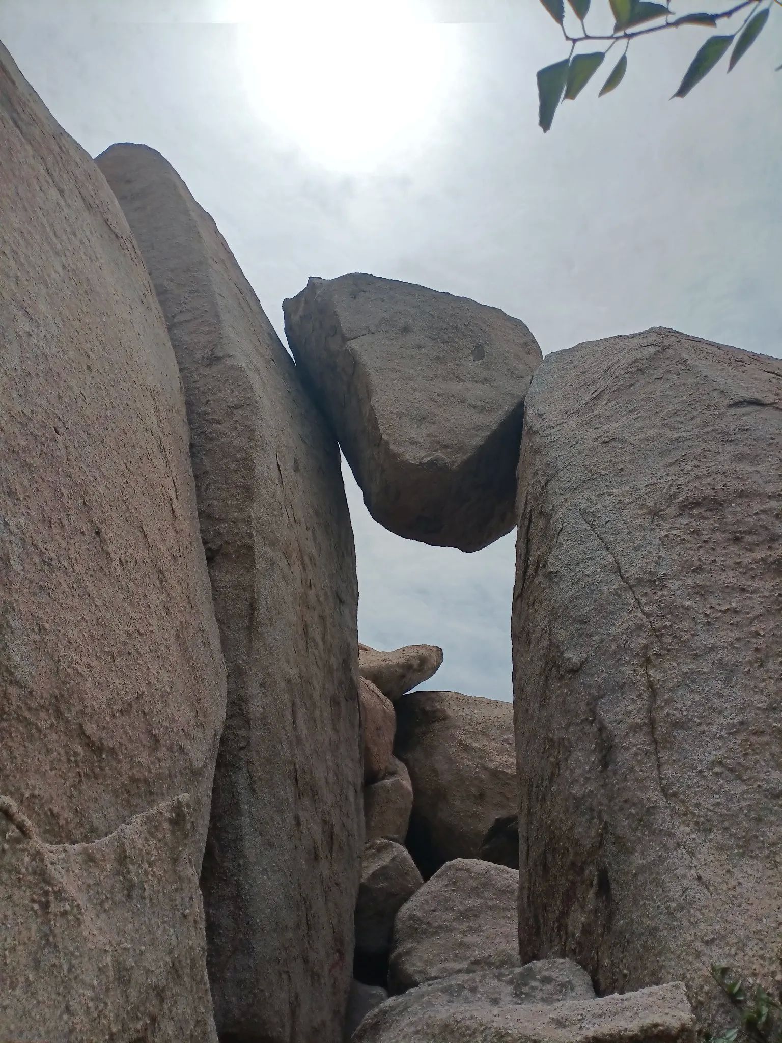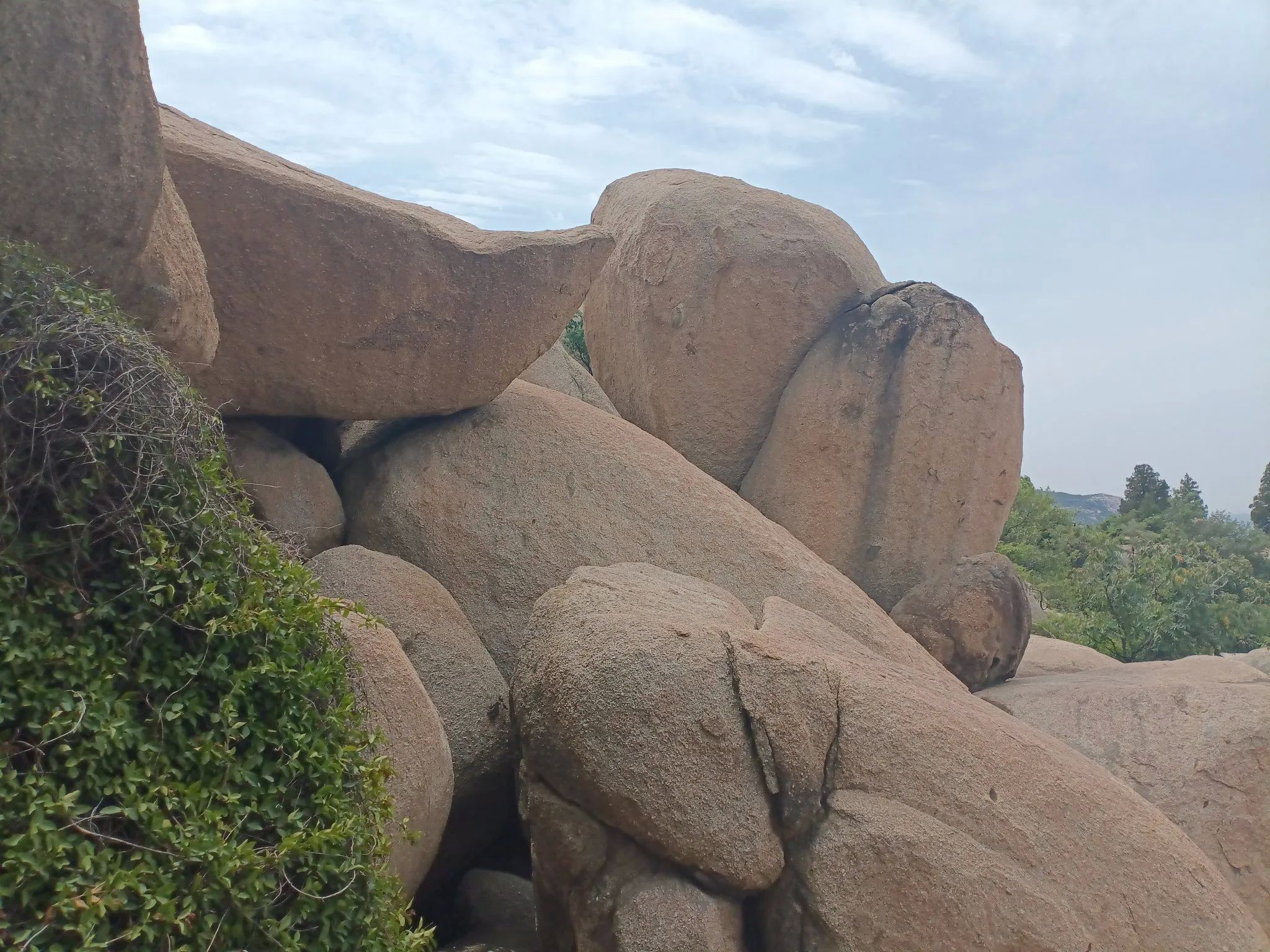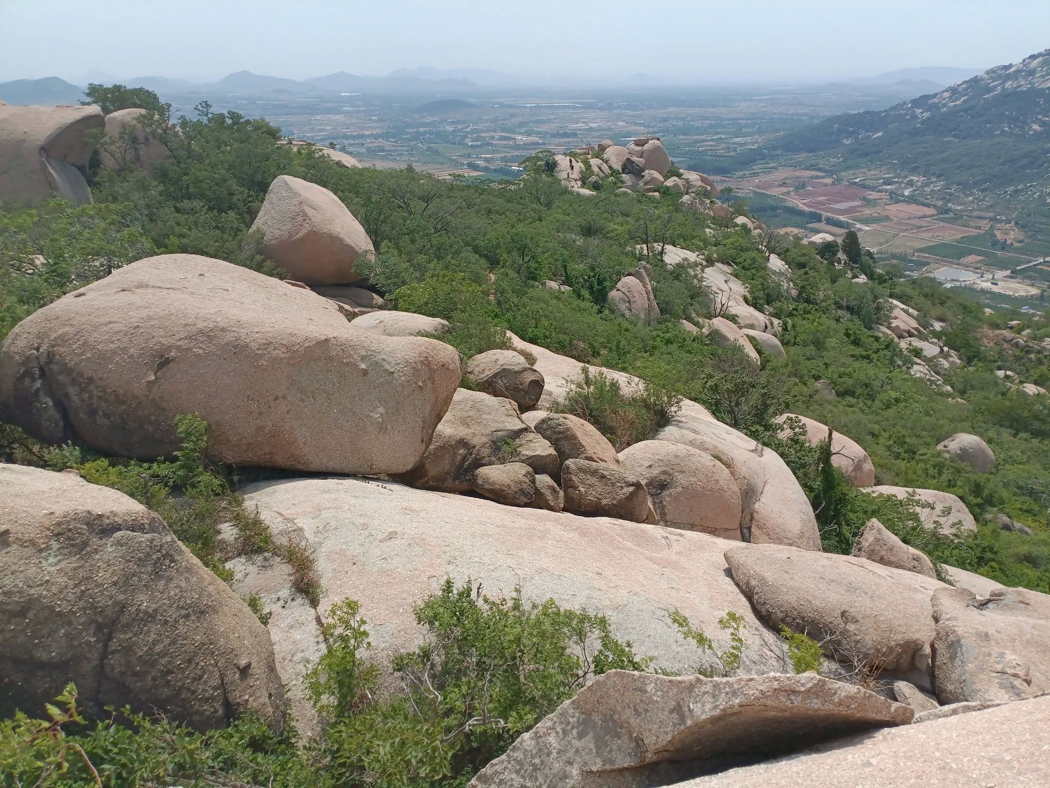 我们从山的北面登山。顺着游人踩出的小路,快速行进,一度十分顺利。有个年轻人甚至抱怨他的一个同伴胆小,这么易登的山却临阵脱逃了。但临近山顶,却被那巨大的石块挡住了去路。我们几人分头行动,试了好几条小道,都不能登顶。明明听到上面有人说话,也看到人家就坐在山顶大石头上,离我们也就二十余步之遥,可我们就是上不去。