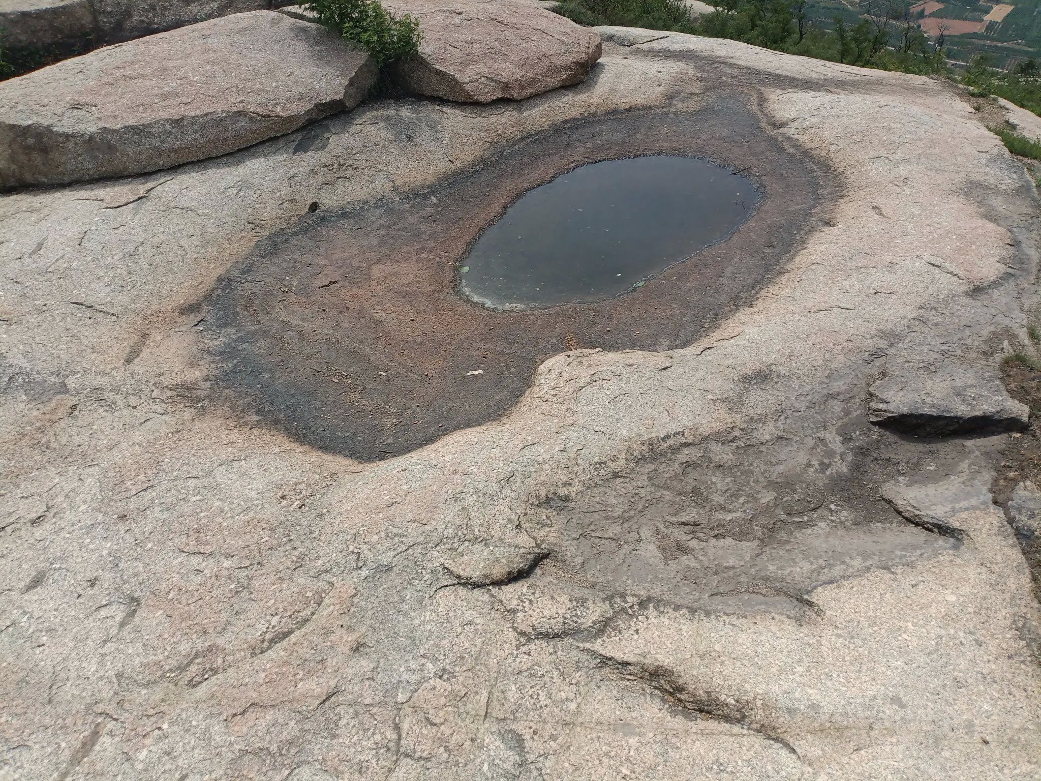 山顶全是巨石,有块巨石上还有天然凹坑,里面还积了不少水。山顶凉风习习,站在山顶,虽还气喘吁吁,想想刚才因找不到路几乎放弃登顶,带着战胜困难后的喜悦,极目运眺,心里只用一个字形容:爽!