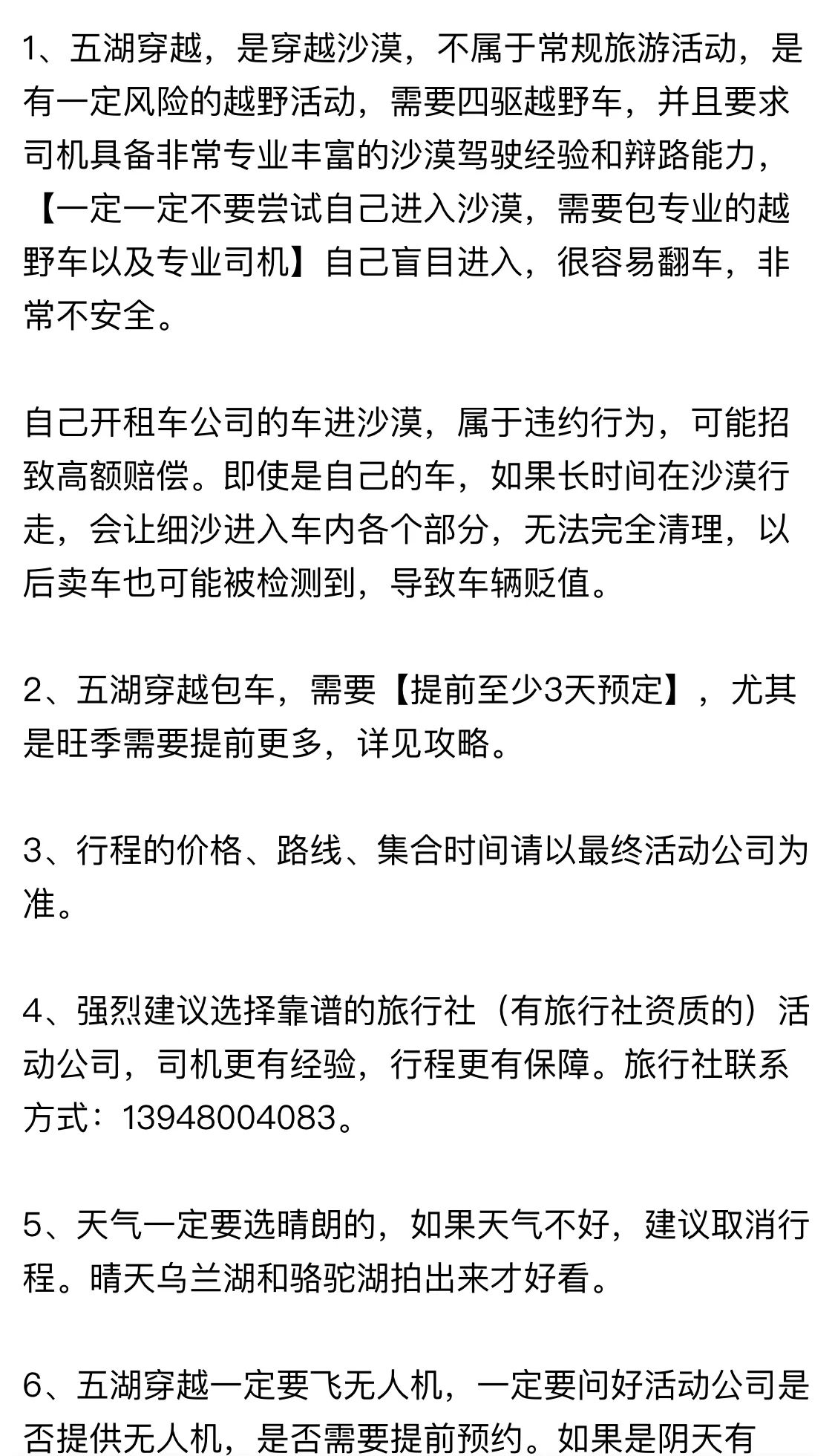 五湖穿越需要包车,请务必要提前预定,时间请以活动公司为准,如果一早集合,也可选择提前一天住到巴彦浩特。