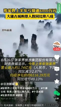 湖南张家界,地标位置大庸古城、三千奇峰和宝峰湖即将迎来五一长假游客的笑脸。可当你们沉醉于这方天地造化时,估计鲜少有友友注意到,这经营着十里画廊观光电车、杨家界索道的山水旅游第一股张旅集团,却在资本市场的深潭中艰难浮沉,连续五年亏损超13亿元,友友们,乍一听这个消息是否感到不可思议,一贯靠山吃山,靠水吃水的泾经营,似乎都成了老百姓的生存之道,但零成本把祖国的大好河山圈起来收门票,怎么还会亏损这么多钱?