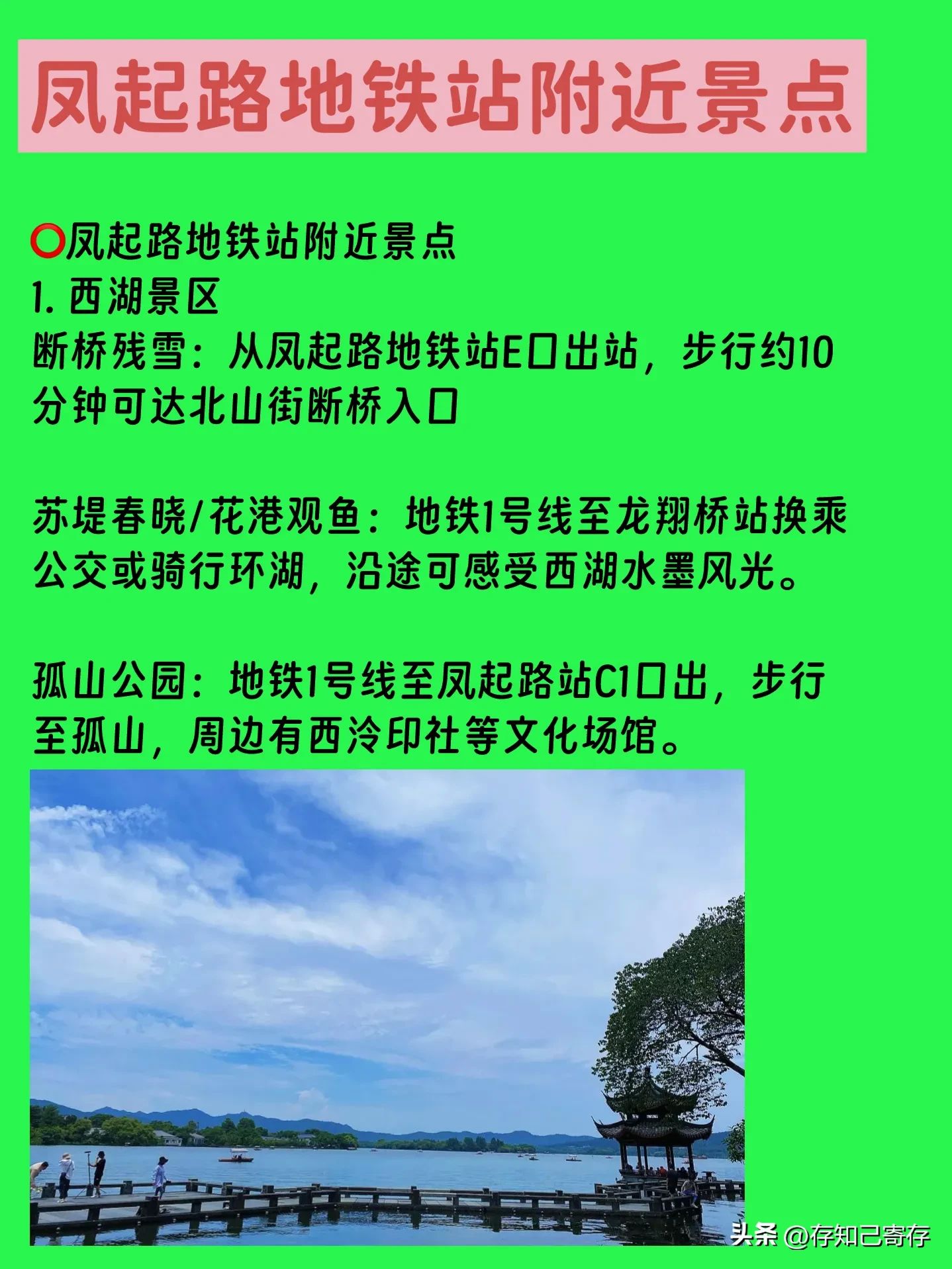 孤山公园:地铁1号线至凤起路站C1口出,步行至孤山,周边有西泠印社等文化场馆。