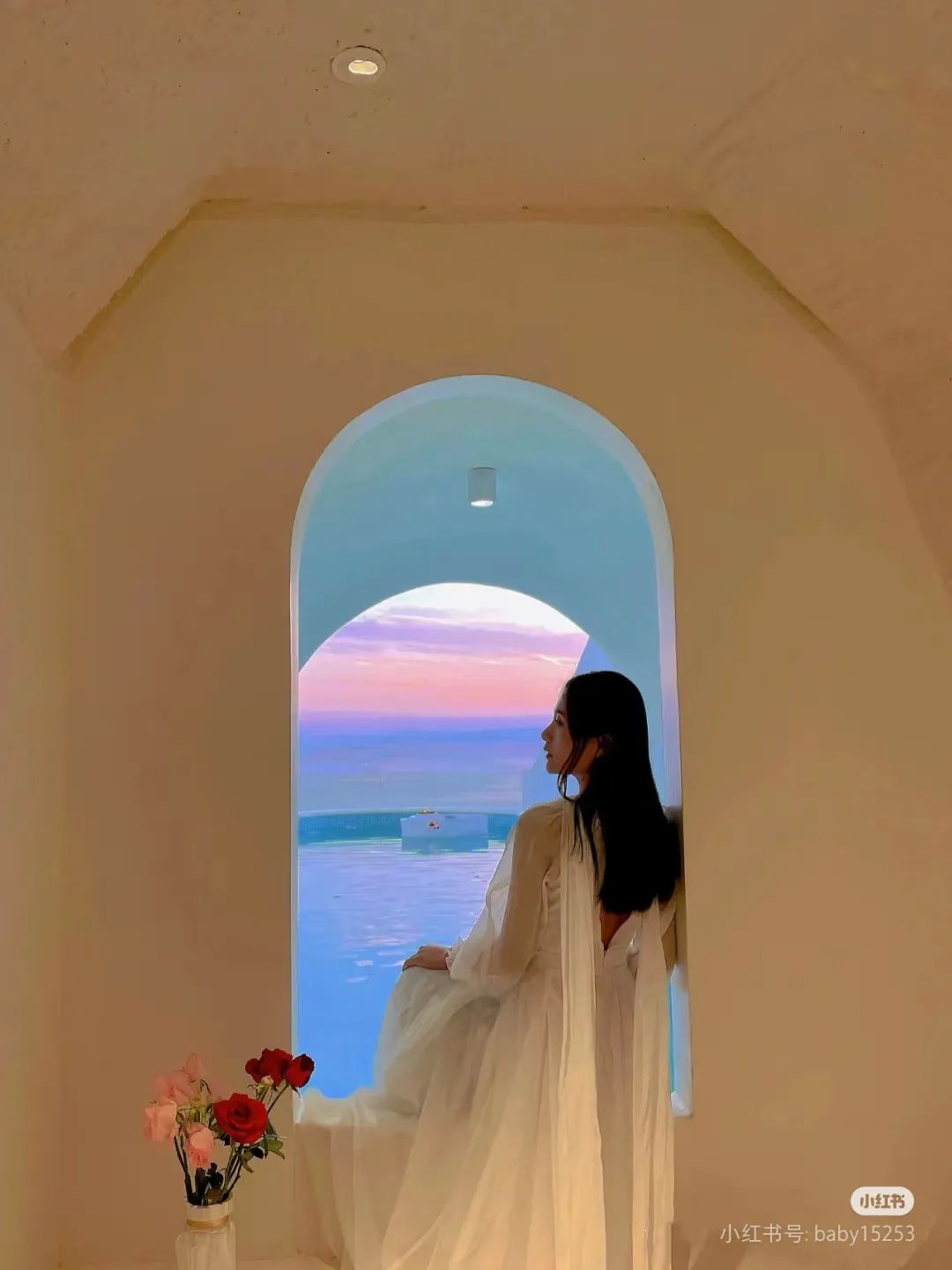海景洞穴泳池房,泳池从屋内一直延伸到屋外,在夕阳晚霞下无比梦幻,游个泳、拍拍照十分惬意。