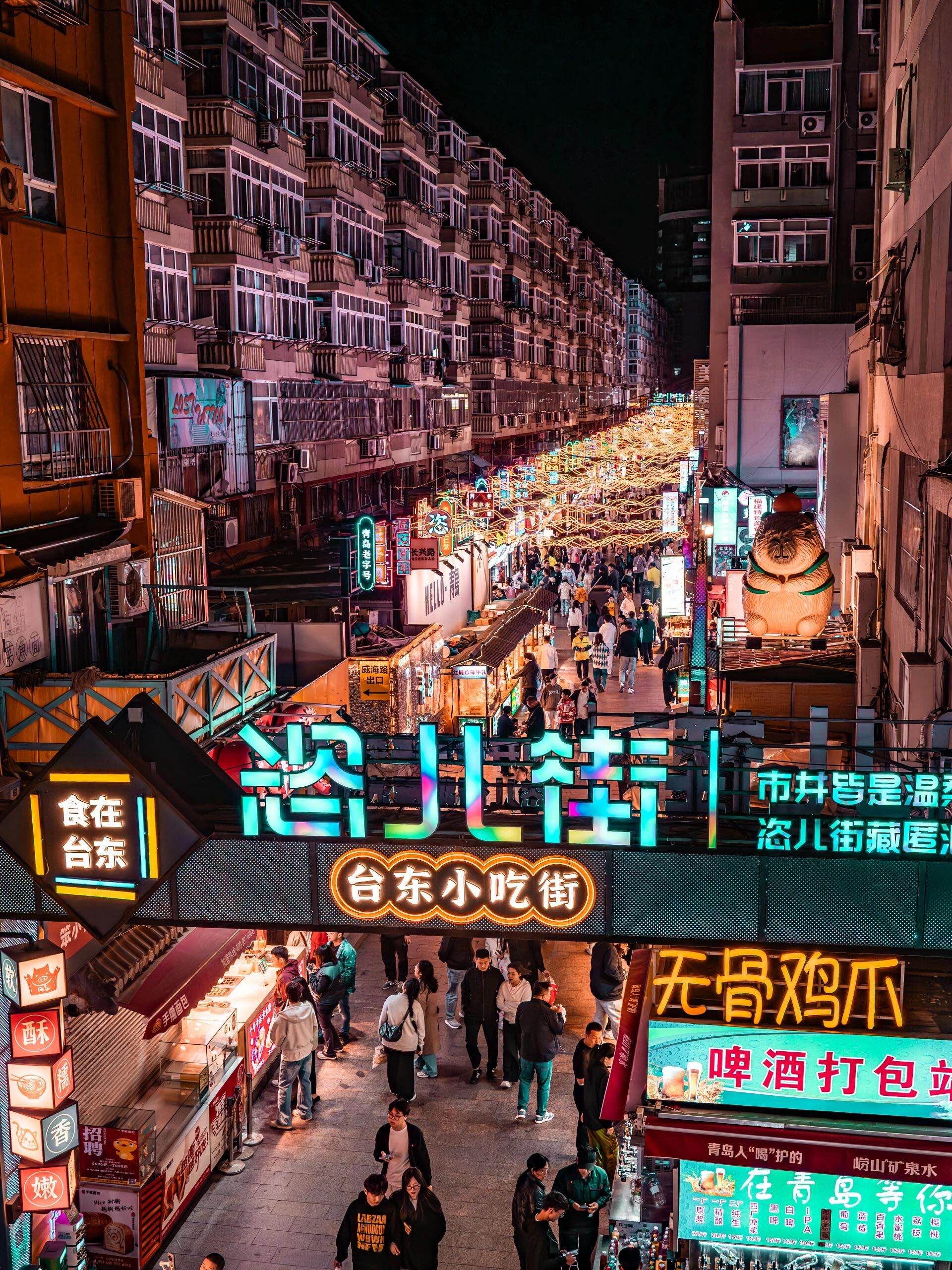 台东夜市天桥:烟火气全景机位,霓虹招牌与小吃摊组成市井大片