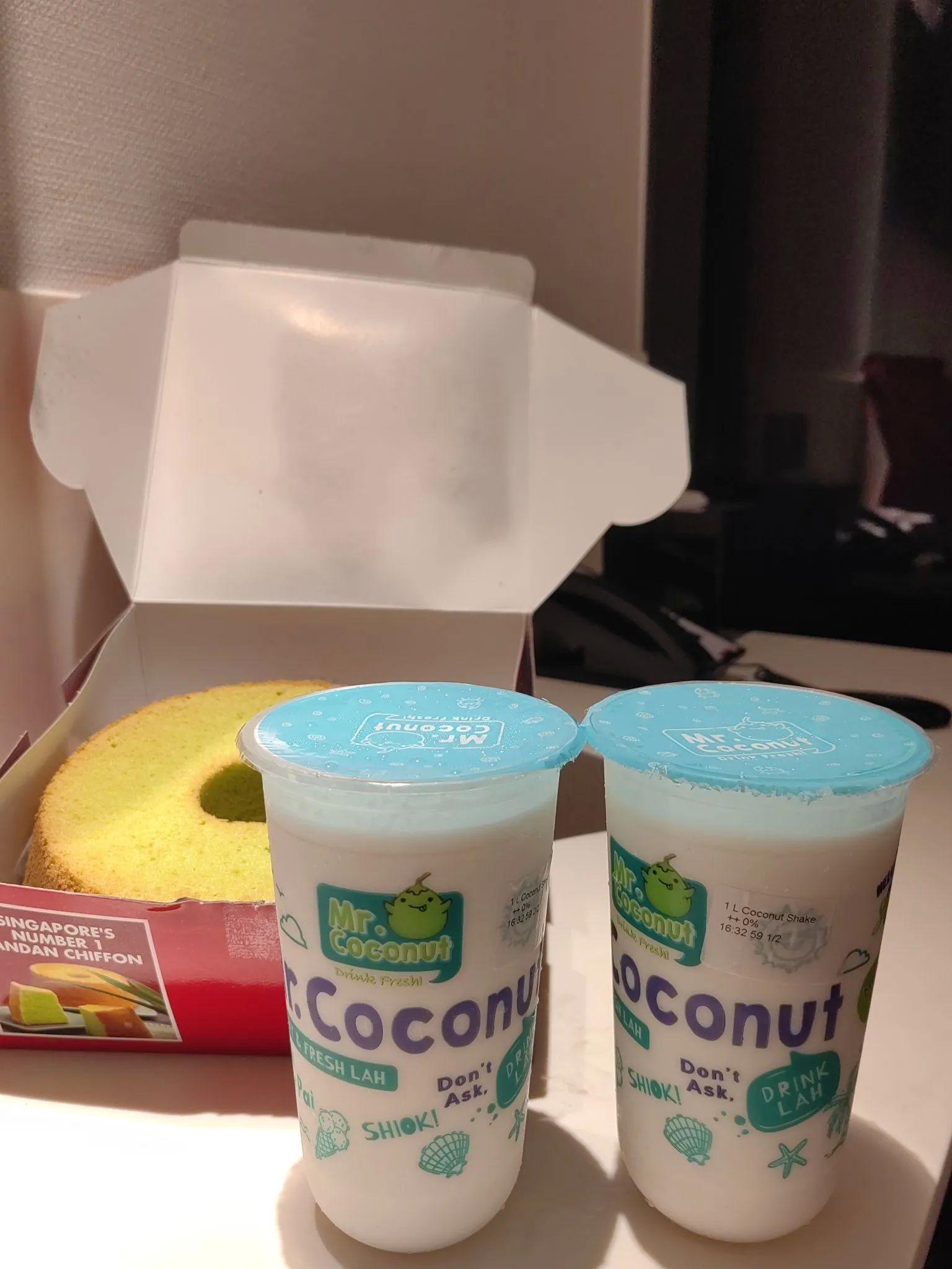 在商场负二楼喝了coconut原味,现金支付,就在旁边吃了肉骨茶,真的好吃,餐桌上有辣椒酱,肉排骨蘸辣椒酱美味,现金支付,还在商场买了斑斓蛋糕——新马的餐厅都不能喝外带的饮料。我们买的奶茶一直带回了酒店才喝的。