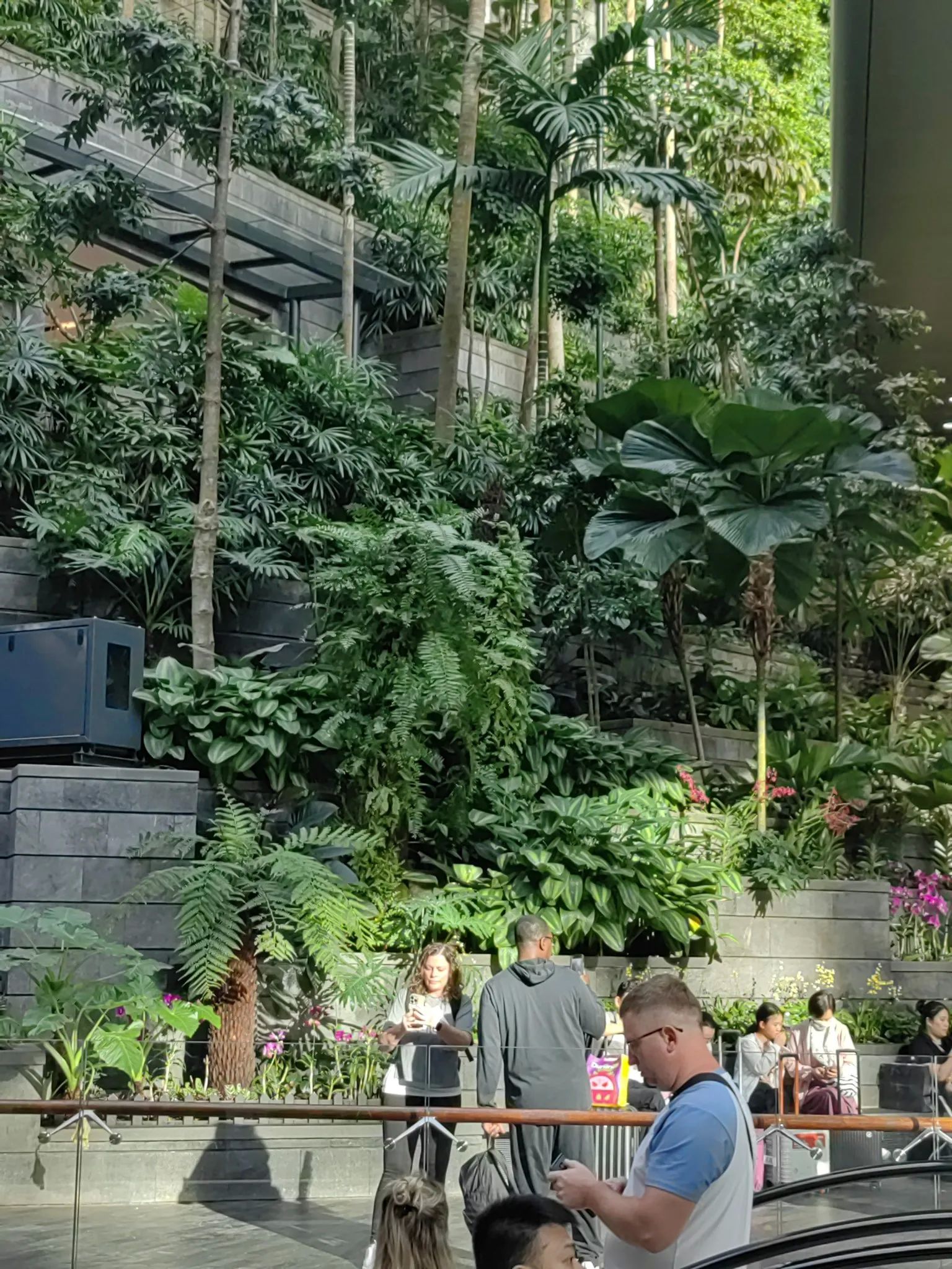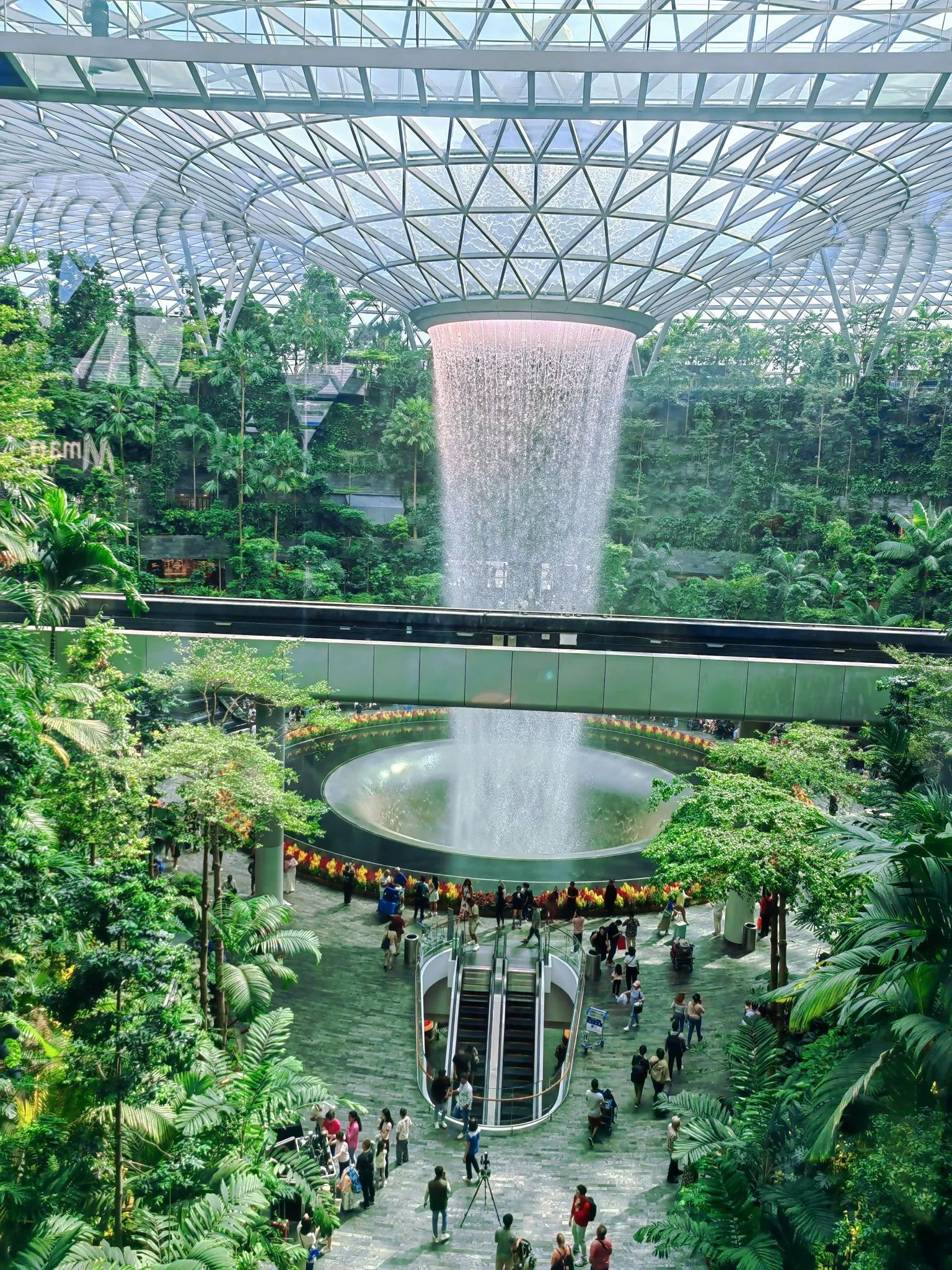 出T1航站楼 过个马路(哈哈,到了你就发现只有几米宽的马路)到JEVEL星耀樟宜(商场)(商场中间)瀑布(Wonder fall)——3楼和瀑布合影/4楼Lobby H/芳吐司前(观景好)