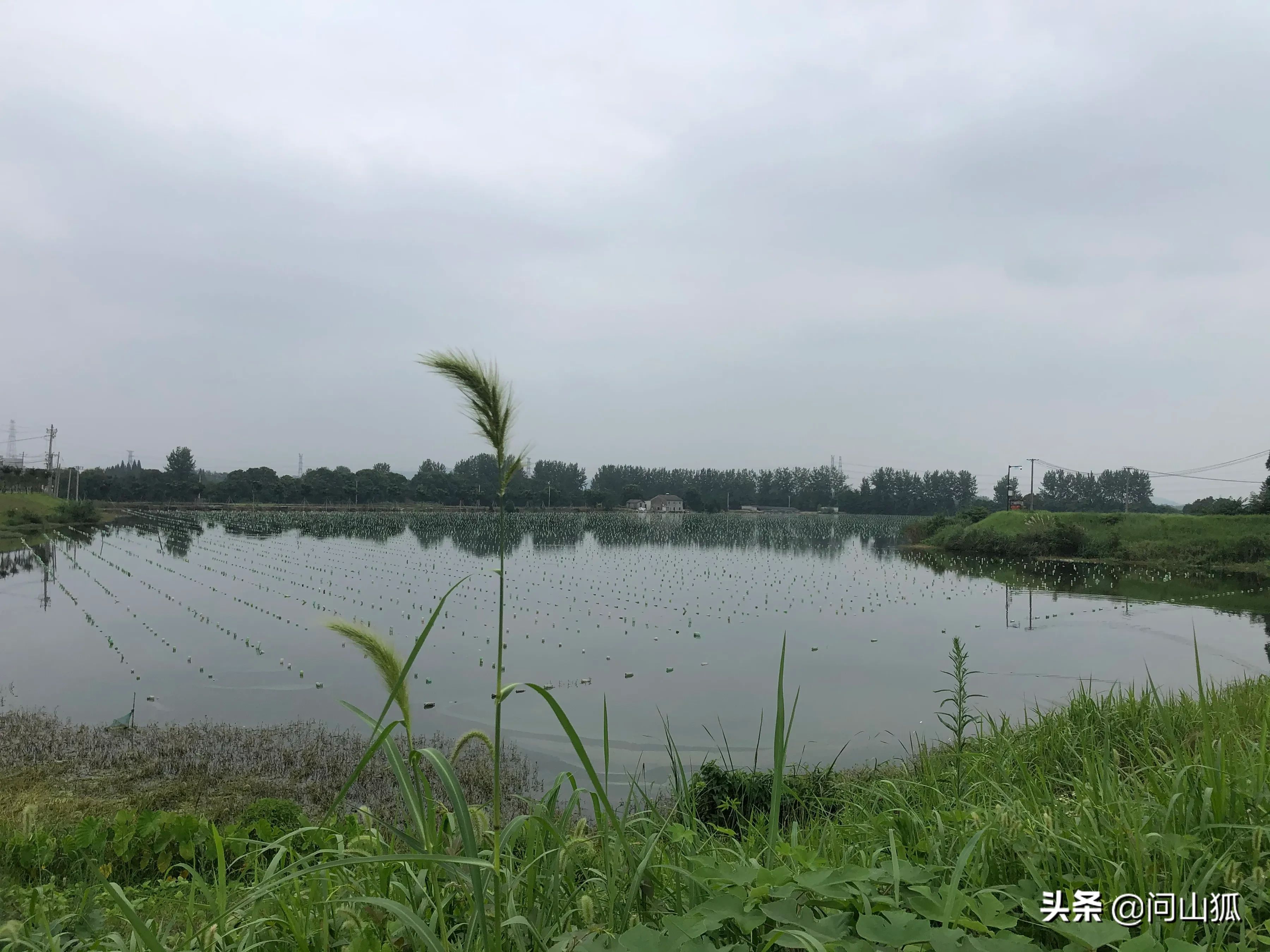 带着这样的疑问昨天来打探:跟着导航眼看就到了,但却很自然的开进了村里,村民告诉我走过了,用手一指,就在屋后头;我返回右转却见一条荒野的堤坝,野草之间有路,铺了些石子,左边一个近百亩的养殖大水塘,水面整齐排列着白色小柱,很好看;再往远处一看,正是大片的芦苇荡。