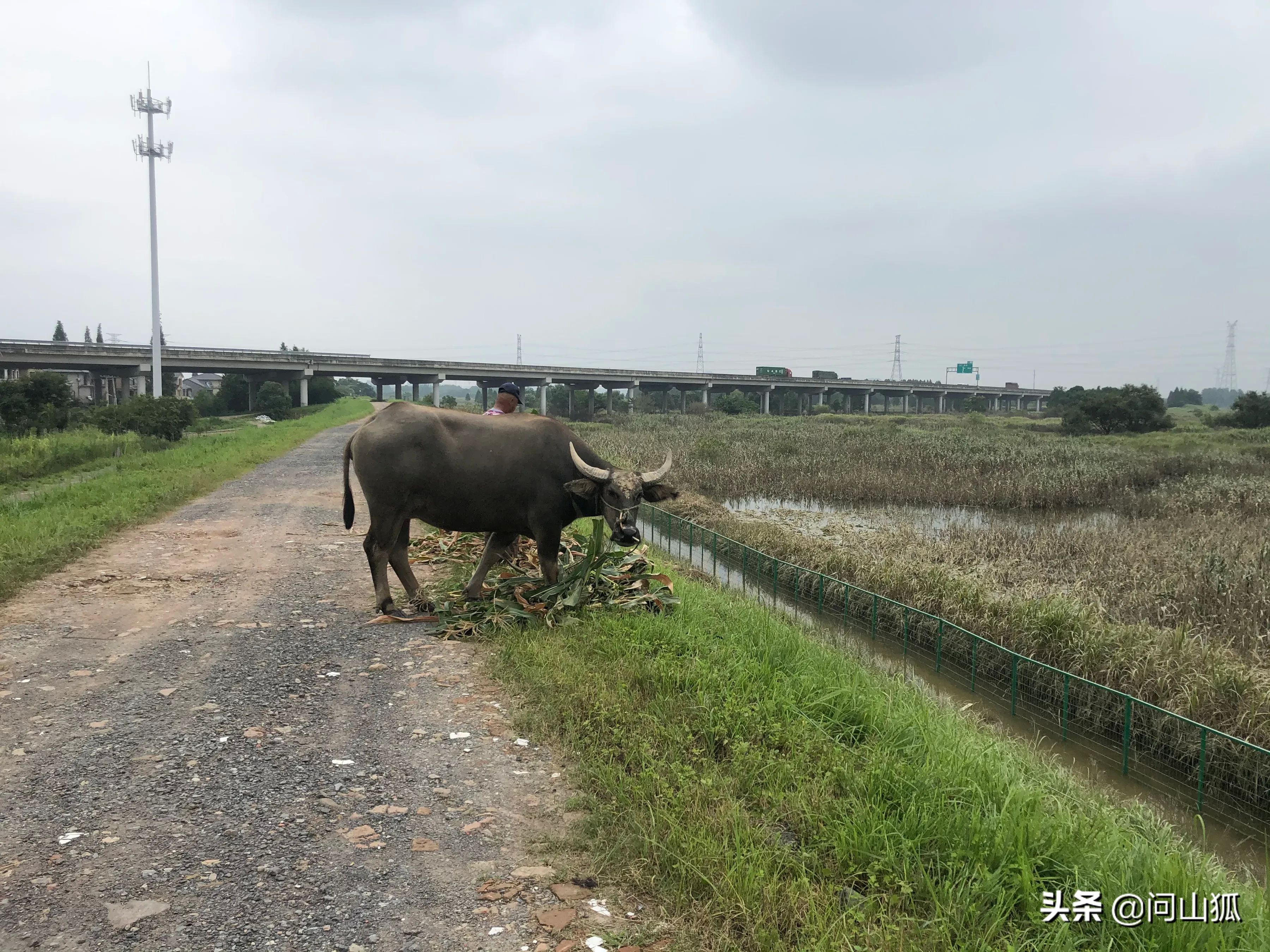 快到尽头时前方隐约有山了,一头水牛在吃草,一男士坐在遮阳蓬下,以为他是放牛的,实际他是在看鱼塘,我问他水为什么是臭的,他说这里是死水塘。