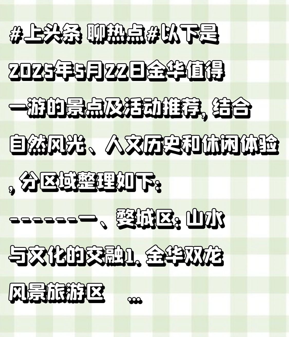 #上头条 聊热点#以下是2025年5月22日金华值得一游的景点及活动推荐,结合自然风光、人文历史和休闲体验,分区域整理如下: