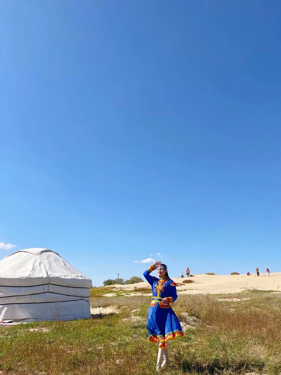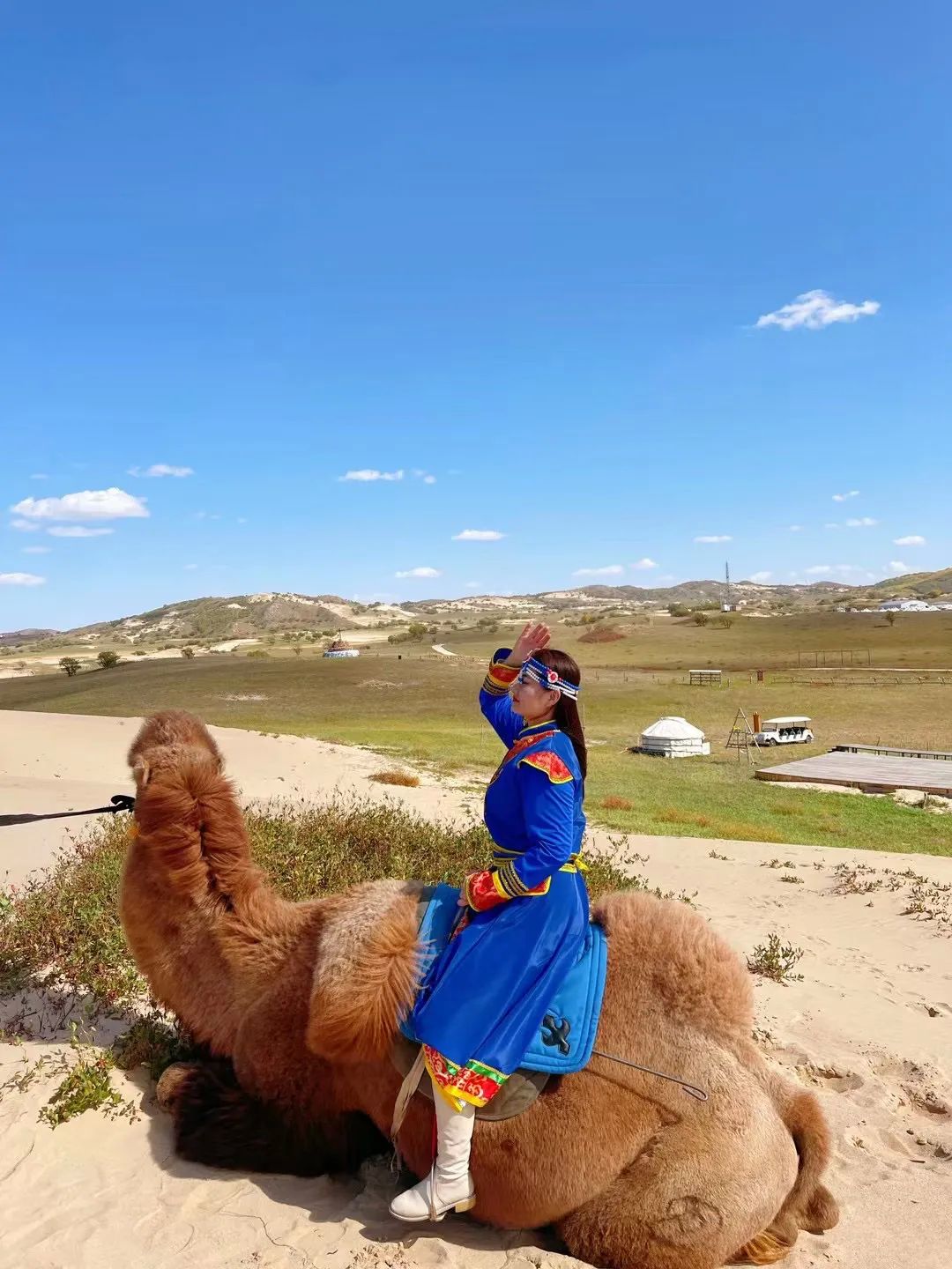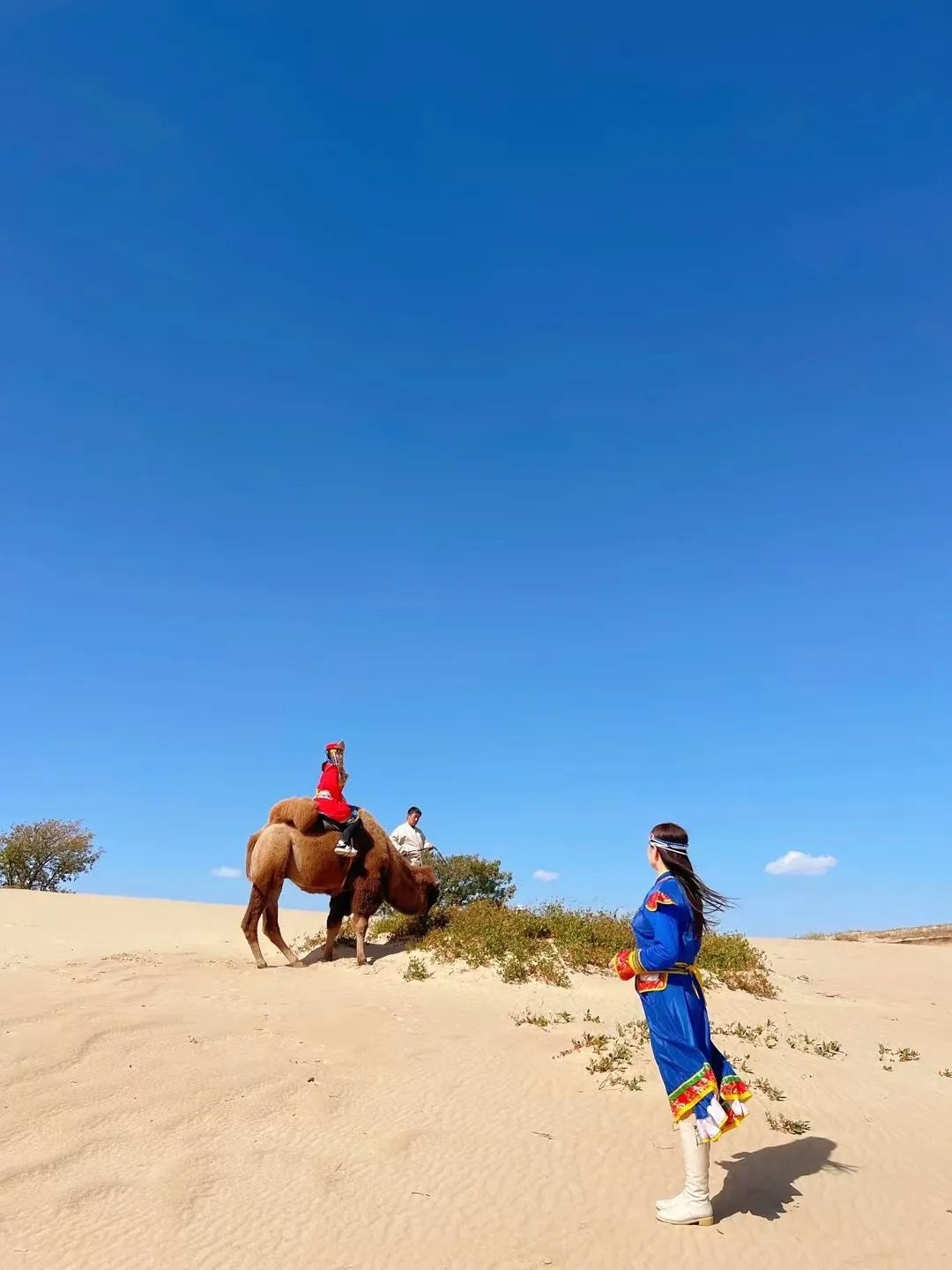 沿途秋天的草原风光无限,令人不禁感叹山河大地的壮丽画卷。汗苏鲁牧场占地辽阔,配套设施一应俱全,中午时分在门口摇曳着美丽格桑花丛的汗苏鲁餐厅吃一顿简餐,然后乘坐景区漂亮的老爷车摆渡车进入牧场。在蒙古部落人家敖包里换上蒙古族服饰,瞬间秒变蒙古族牧民,骑上骆驼上沙山感受这里的别样风景。