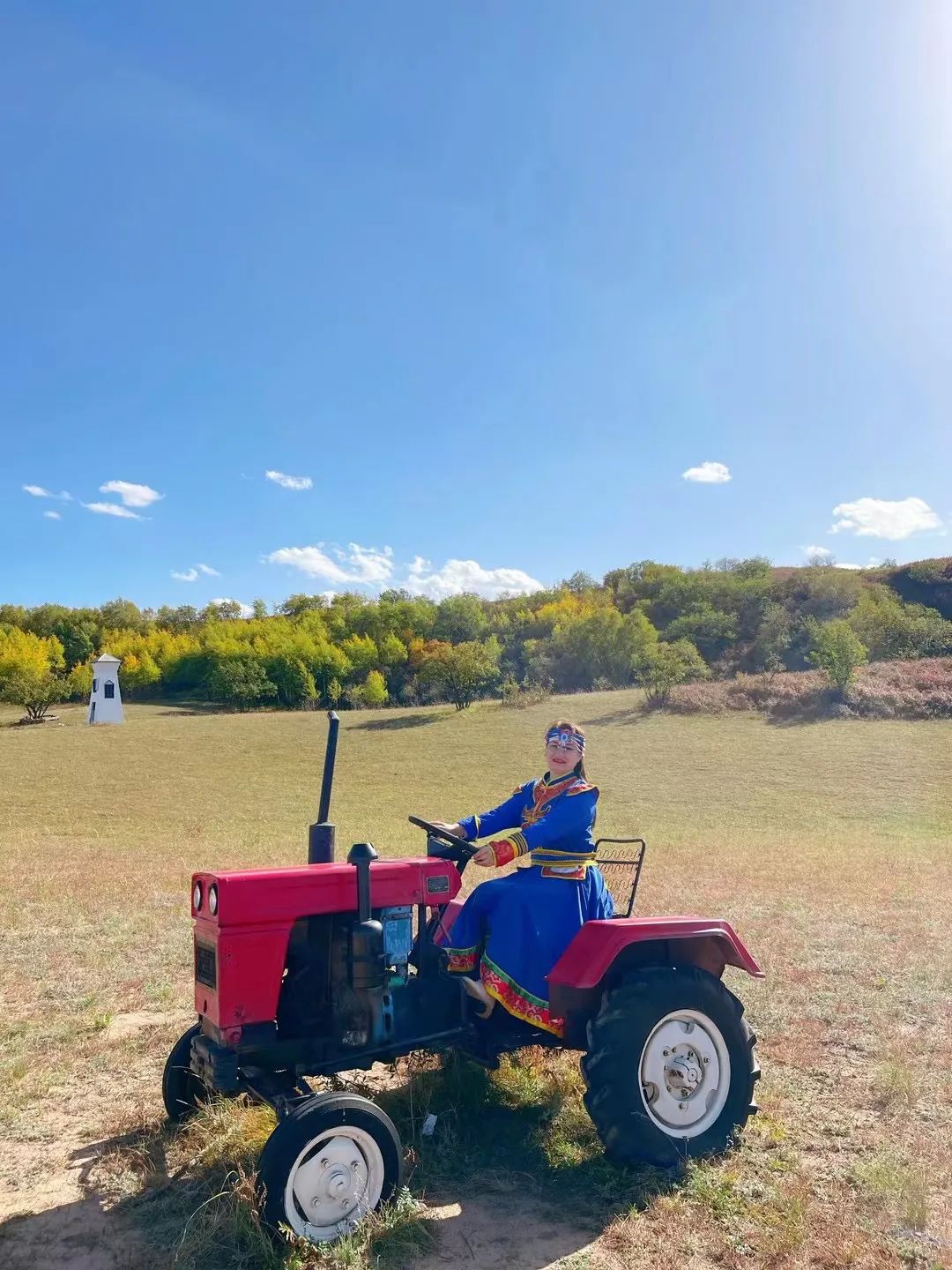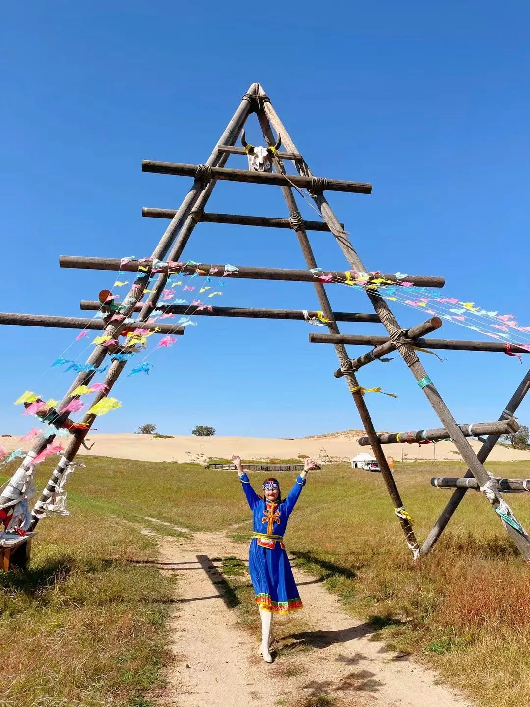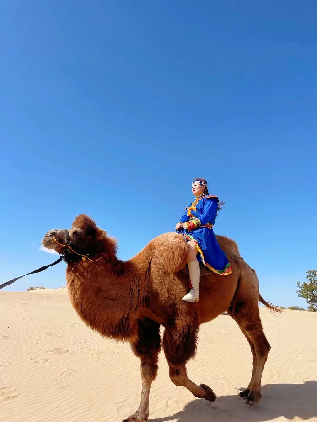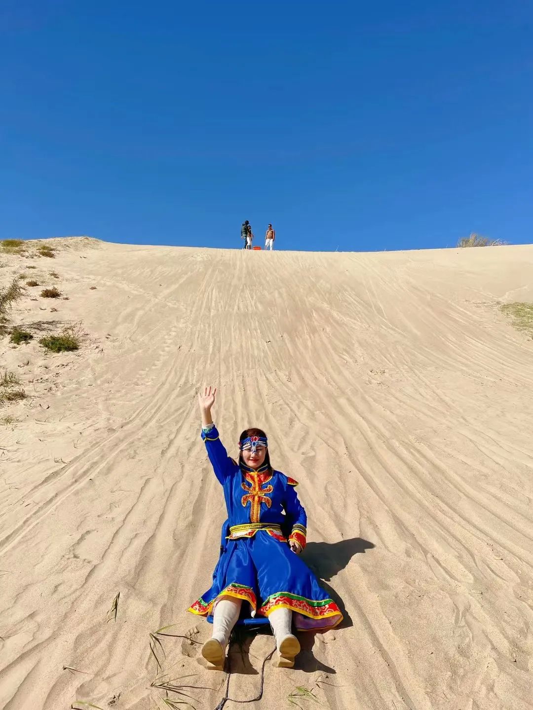 沿途秋天的草原风光无限,令人不禁感叹山河大地的壮丽画卷。汗苏鲁牧场占地辽阔,配套设施一应俱全,中午时分在门口摇曳着美丽格桑花丛的汗苏鲁餐厅吃一顿简餐,然后乘坐景区漂亮的老爷车摆渡车进入牧场。在蒙古部落人家敖包里换上蒙古族服饰,瞬间秒变蒙古族牧民,骑上骆驼上沙山感受这里的别样风景。