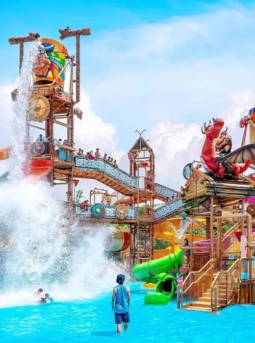 6、融创水世界:夏日必冲!18米高垂直滑道3秒坠入浪花,270米龙卷风暴漂流全程尖叫,恒温系统让冬天也能玩冲浪,亲子区有10+童话主题池。