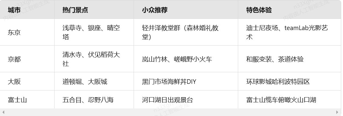 城市热门景点小众推荐特色体验东京浅草寺、银座、晴空塔轻井泽教堂群(森林婚礼教堂)迪士尼夜场、teamLab光影艺术京都清水寺、伏见稻荷大社岚山竹林、嵯峨野小火车和服变装、茶道体验大阪道顿堀、大阪城黑门市场海鲜丼DIY环球影城哈利波特园区富士山五合目、忍野八海河口湖日出观景台富士山缆车俯瞰火山口湖
